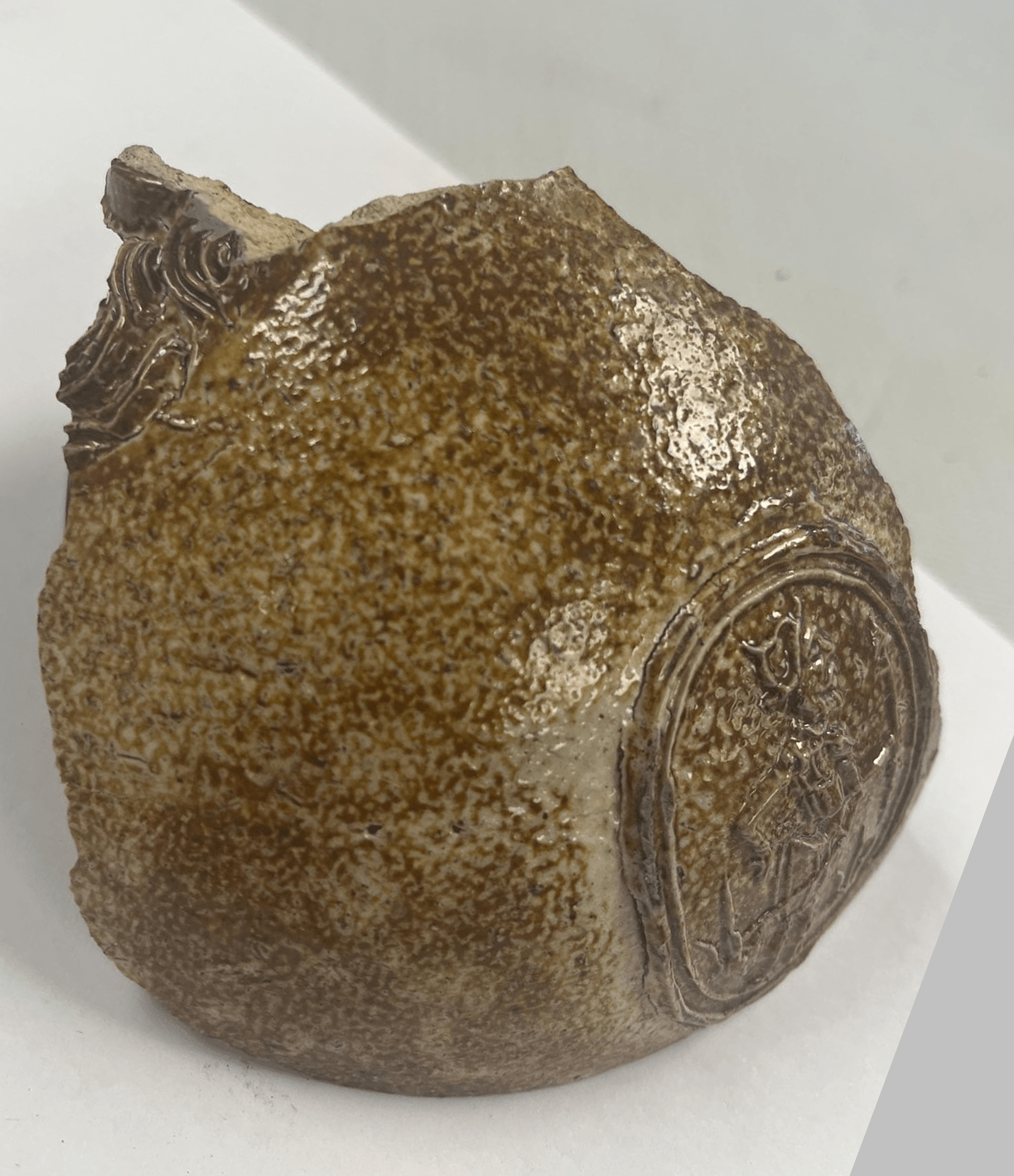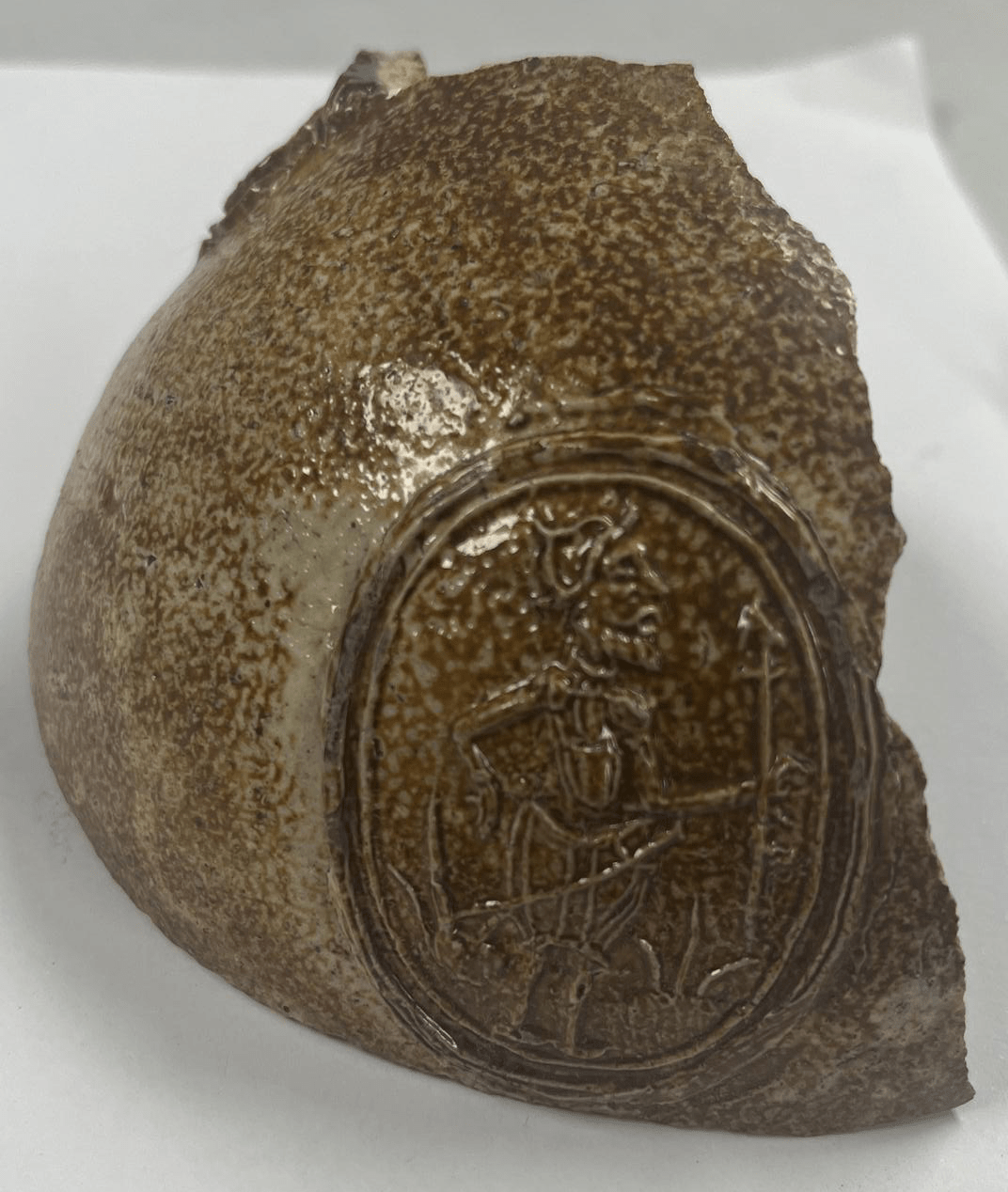 Feature description: Partial face mask only, edge of beard and lip. Position of face mask in relation to medallion suggest it may have been a three medallion jug