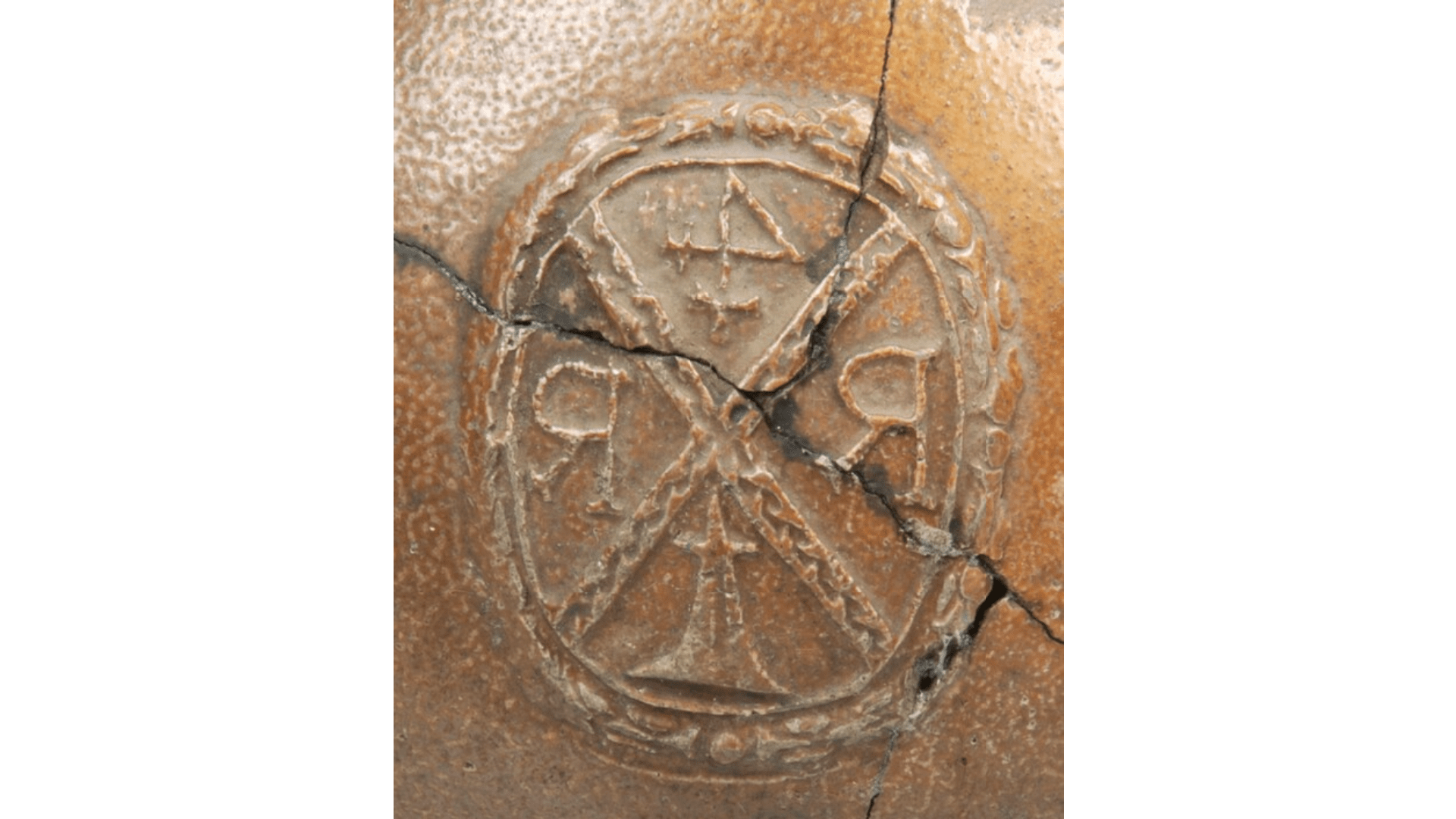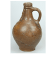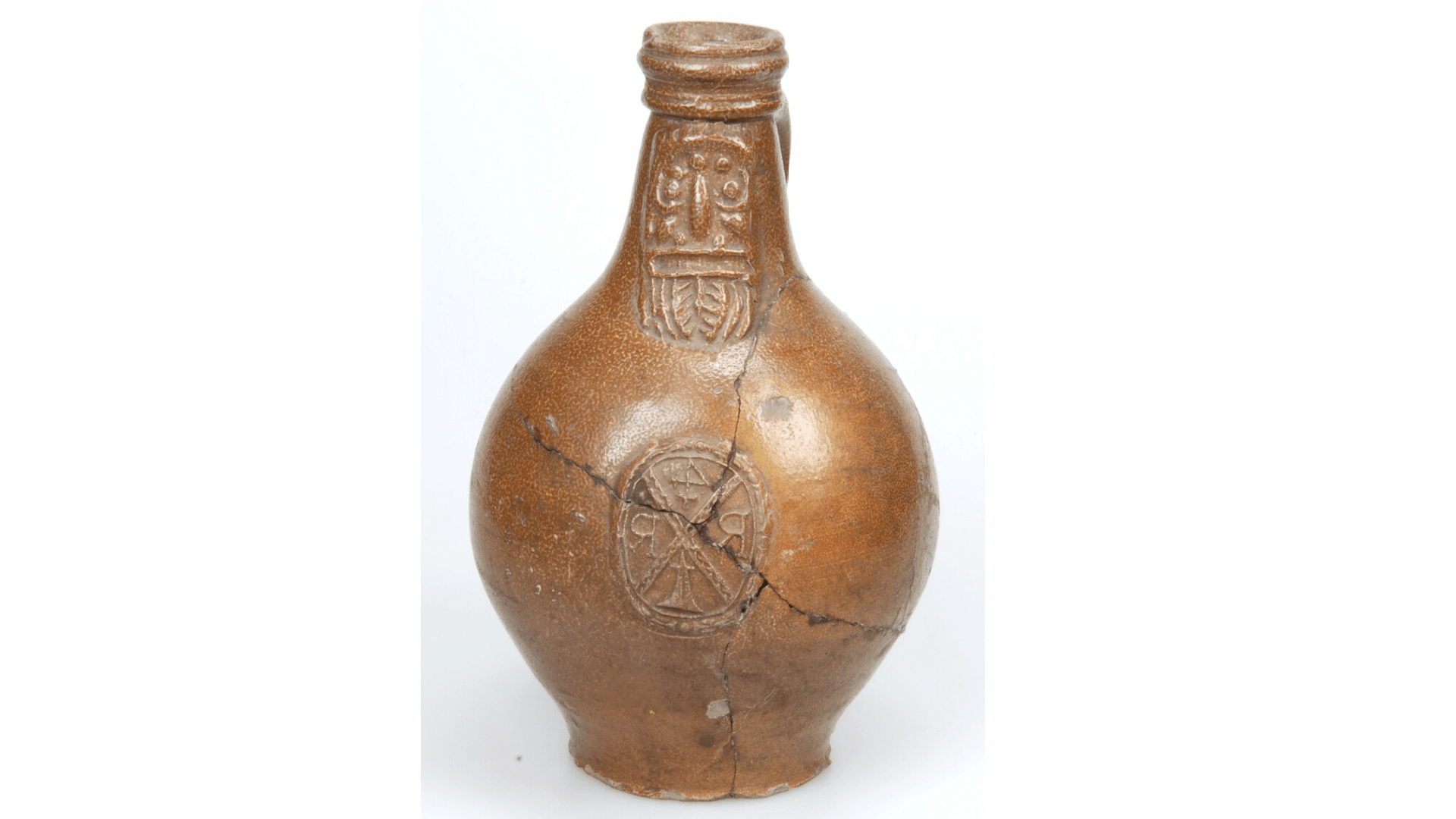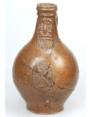 Feature description: Bartmann jug; s2-kan-32; narrow neck; salt glaze and iron engobe; band mark; ovoid body; stylised mask with closed mouth, beard rendered with lines, St. Andrew's cross on the body of the jug with the letters R&R and a house mark; place of manufacture: Frechen.