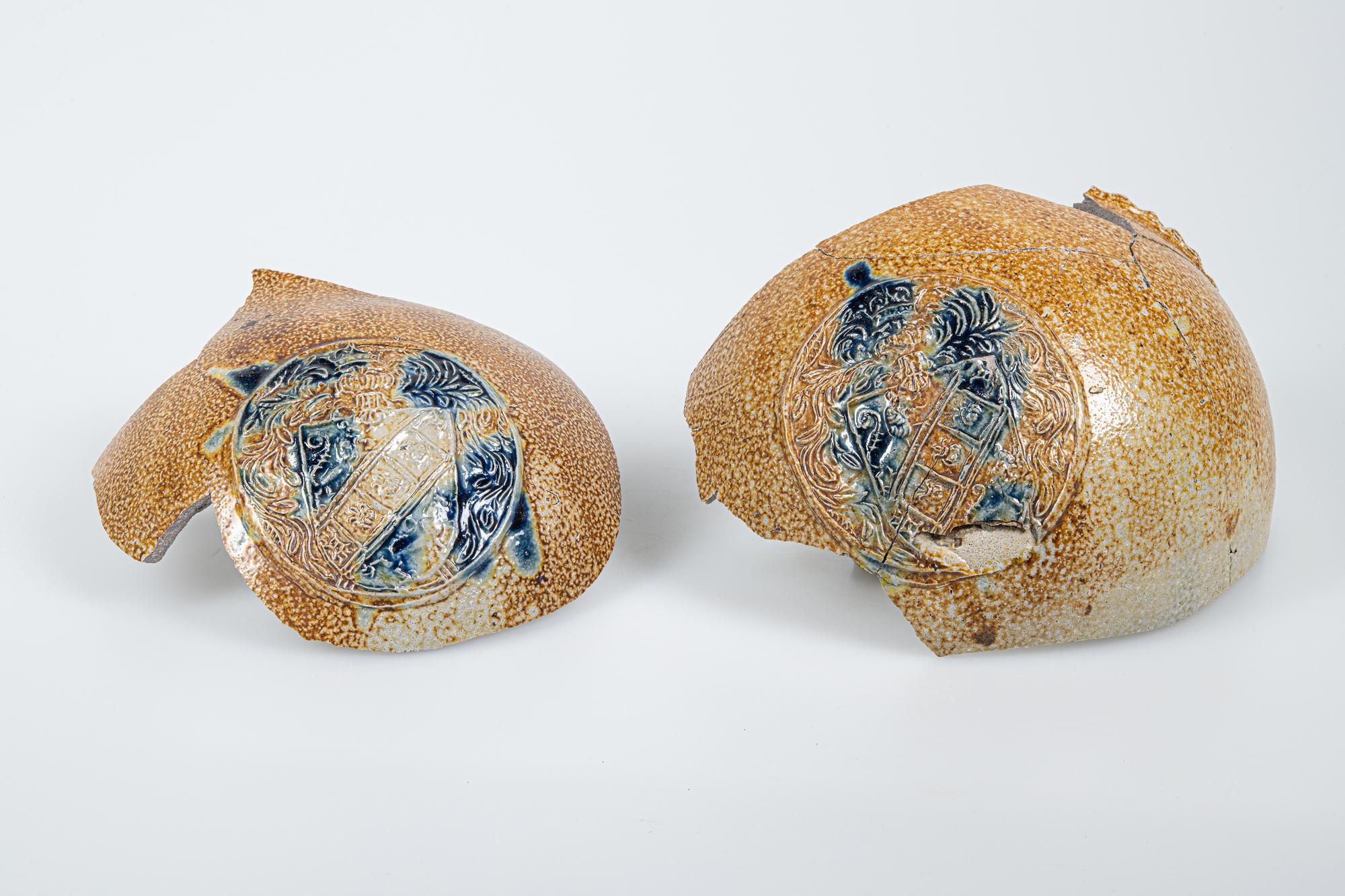 Feature description: Bartmann jug (wall fragments); s2-kan-; stoneware with surface treatment: iron engobe with accents of cobalt oxide, salt glaze; appliqués on belly: two medallions with crowned coat of arms: diagonal band with, among other things, three pomegranates, flanked by two standing lions; origin: Frechen, Germany.