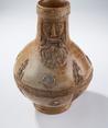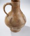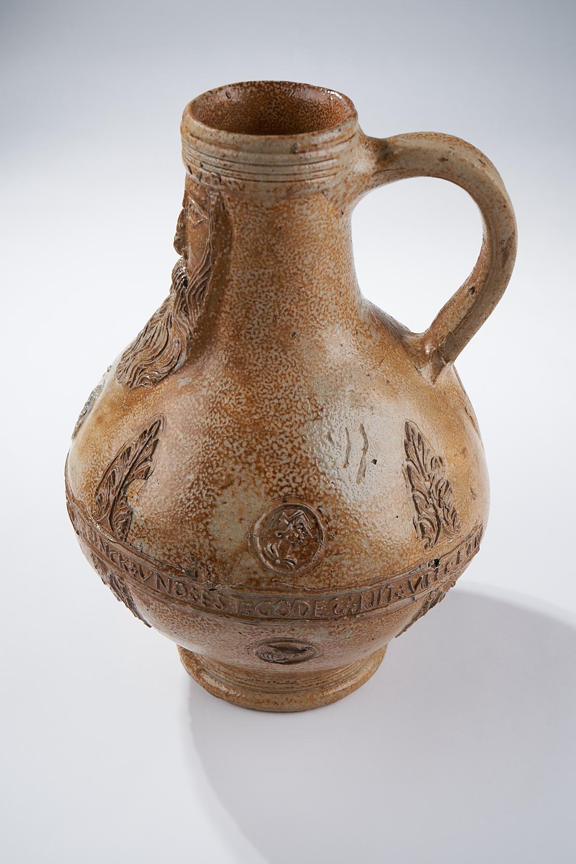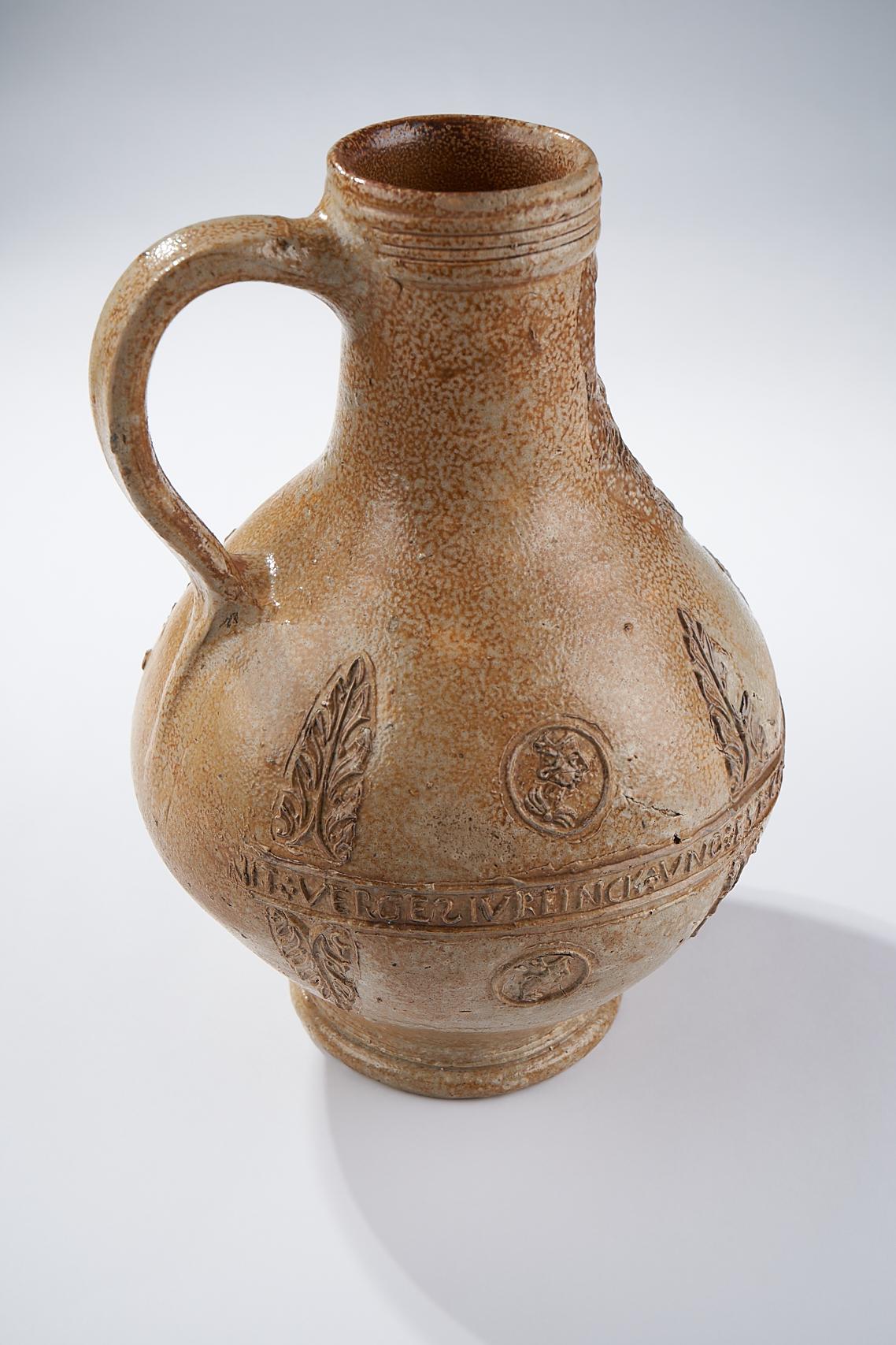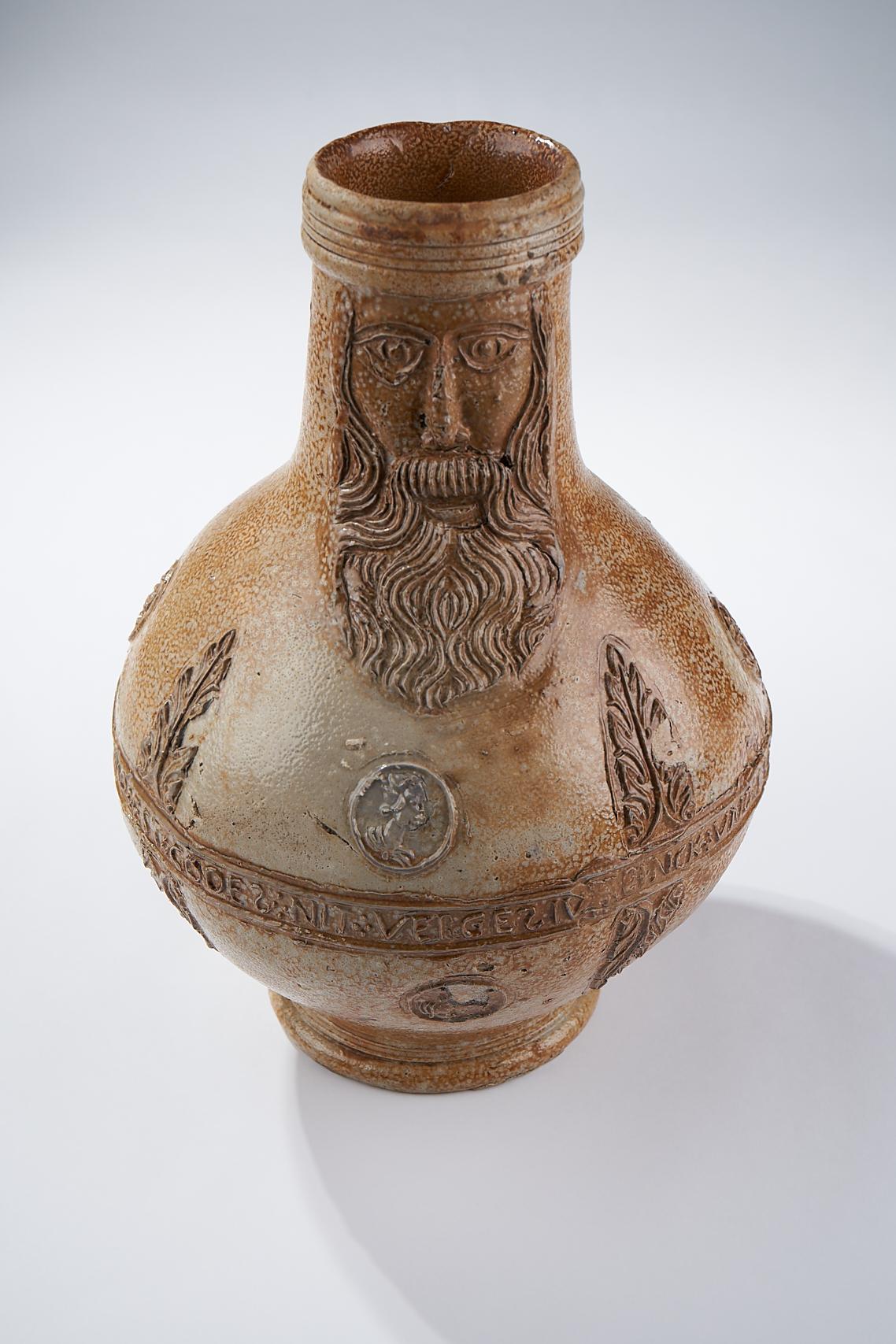 Feature description: A bartmann jug decorated with an embossed bearded head, six medallions, four acanthus leaves and a horizontal frieze containing an inscription: NIT VERGEZ IV REINCK UND EST GODEZ NIT VERGEZ IV REINCK UND EST GODEZ NIT VERGEZ IV, German stoneware (Frechen).