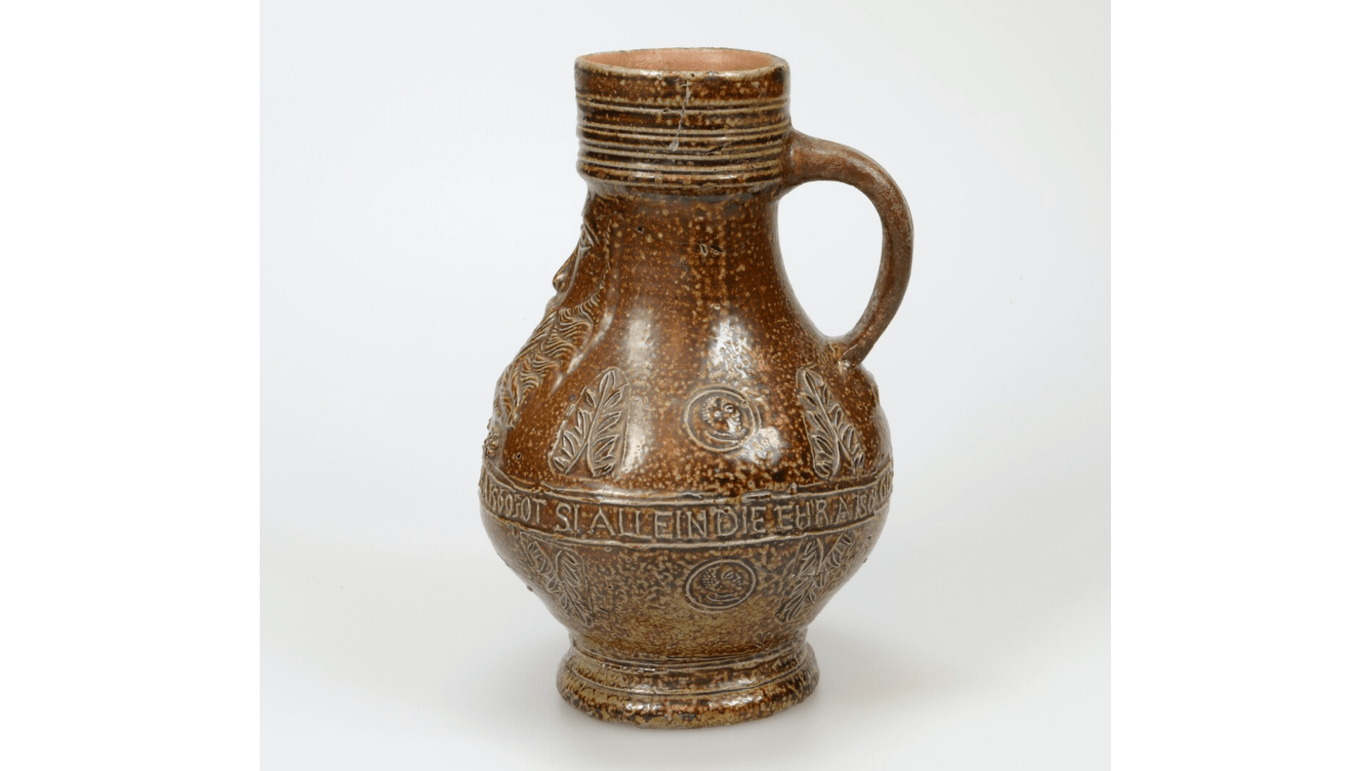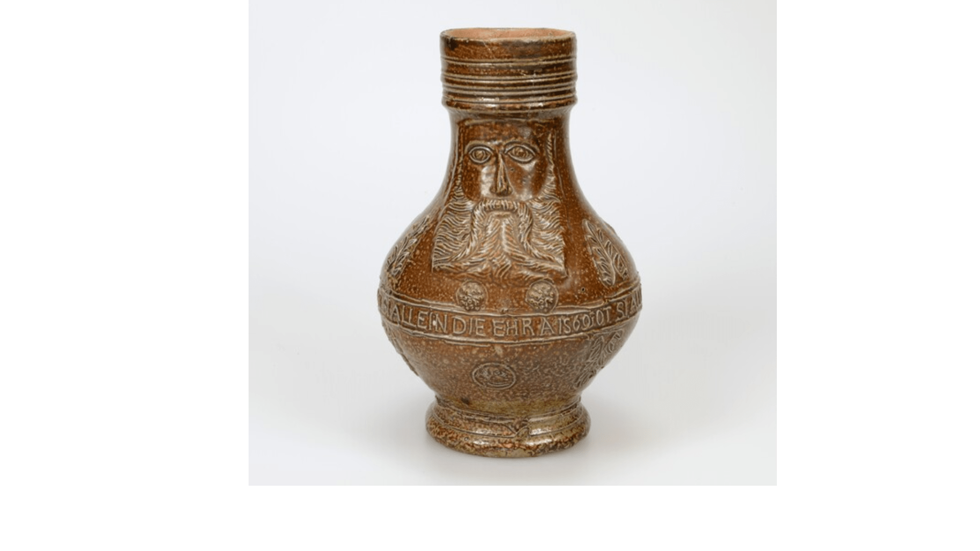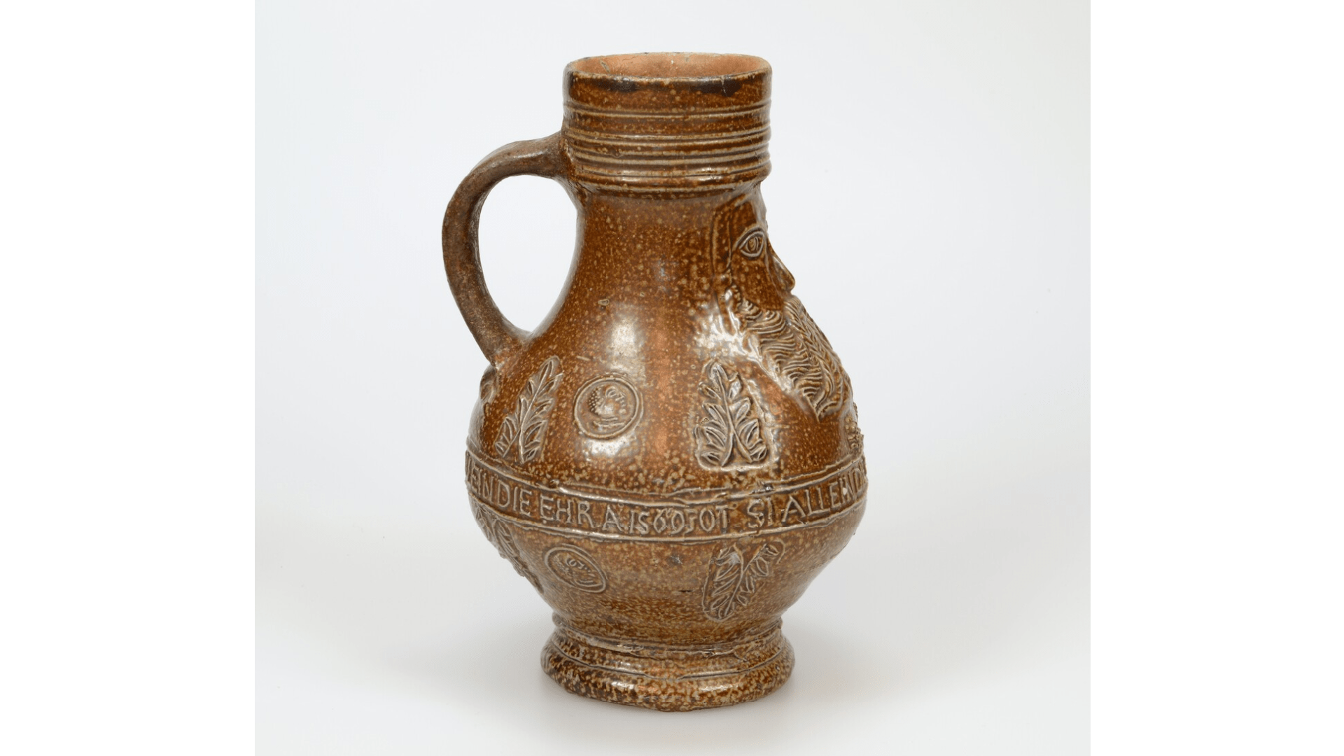 Feature description: Bartmann jug; s2-kan-58; convex jug with rounded belly, shoulder transitioning into a high neck with collar rim, ribbon handle, foot; stoneware with surface treatment: iron engobe, salt glaze; decoration with appliqués: mask on the neck with elaborate beard, extending over the belly; on the belly: horizontal text band with the text: GOT SI ALLEIN DIE EHR A 1569' free translation: only glory to God, anno 1569; the text band is edged on both sides with acanthus leaves and portrait medallions; origin: Frechen or Cologne, Rhineland