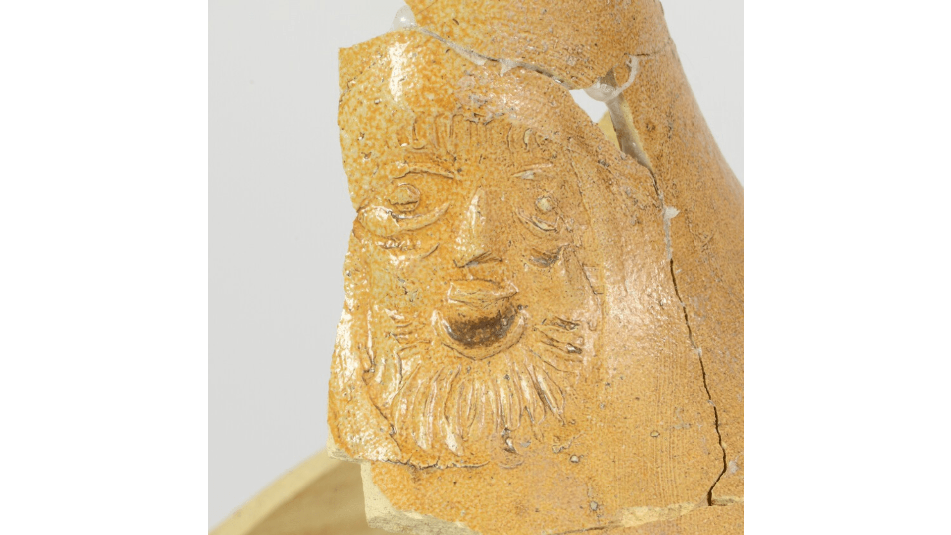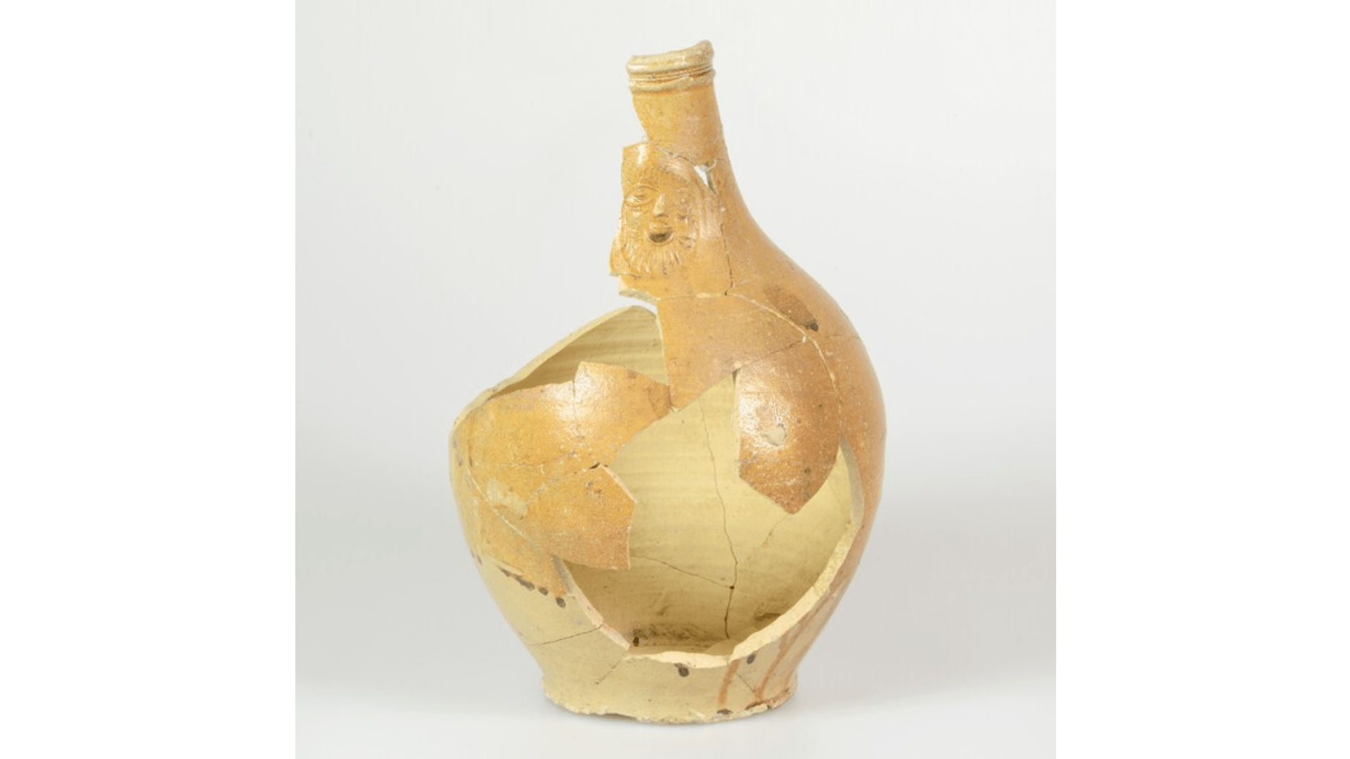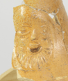 Feature description: Bartmann jug; s2-jug-32; convex jug with shoulder transitioning into a high neck with ribbed collar edge; stoneware with salt glaze, iron engobe; mask on neck; flat base; handle missing.