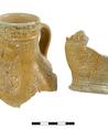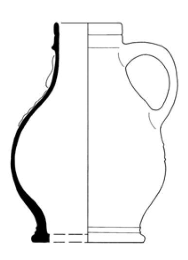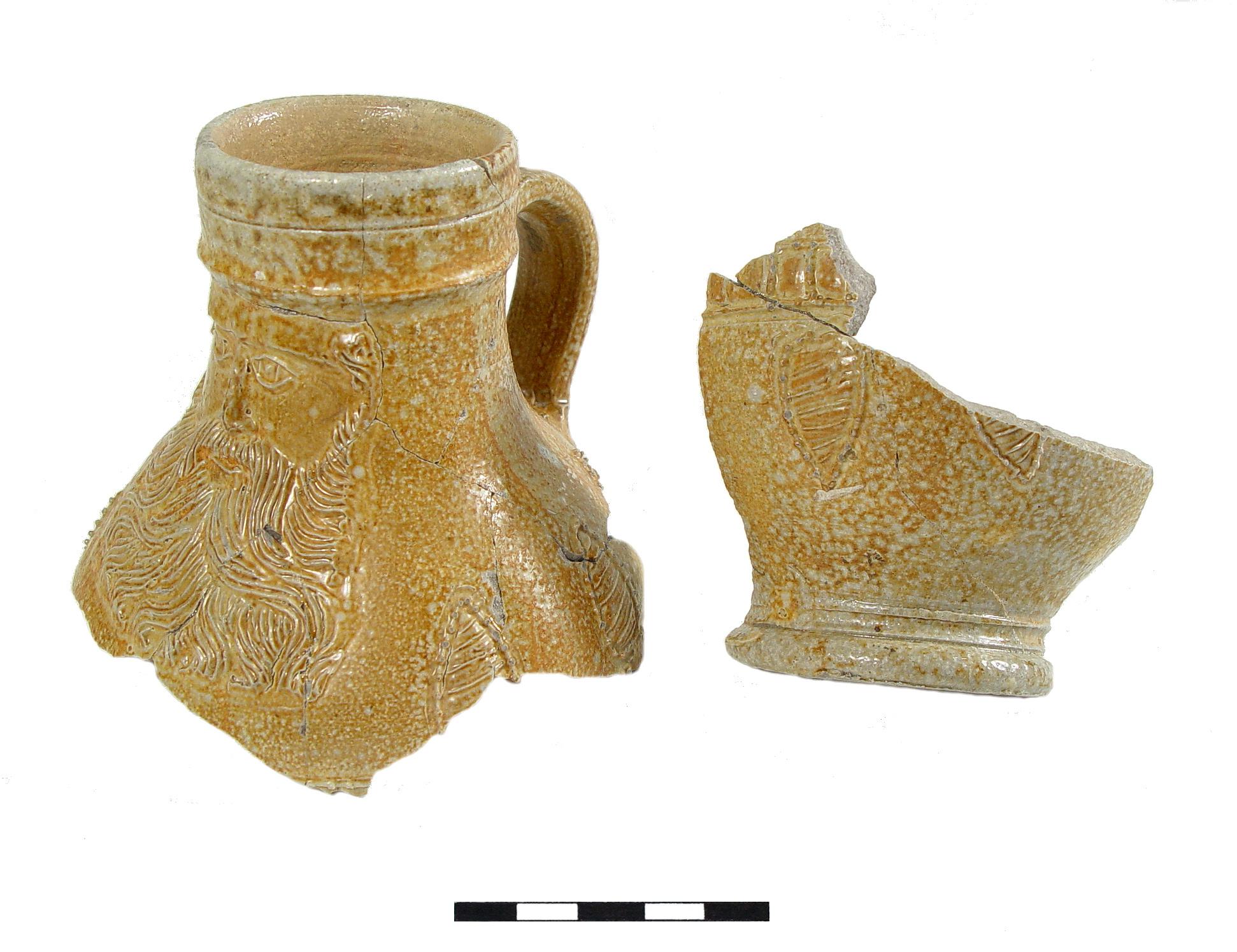 Feature description: Bartmann jug; stoneware with surface treatment; salt glaze with iron engobe; appliqués: mask, leaves; foot; ribbon handle; origin: Cologne.