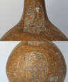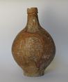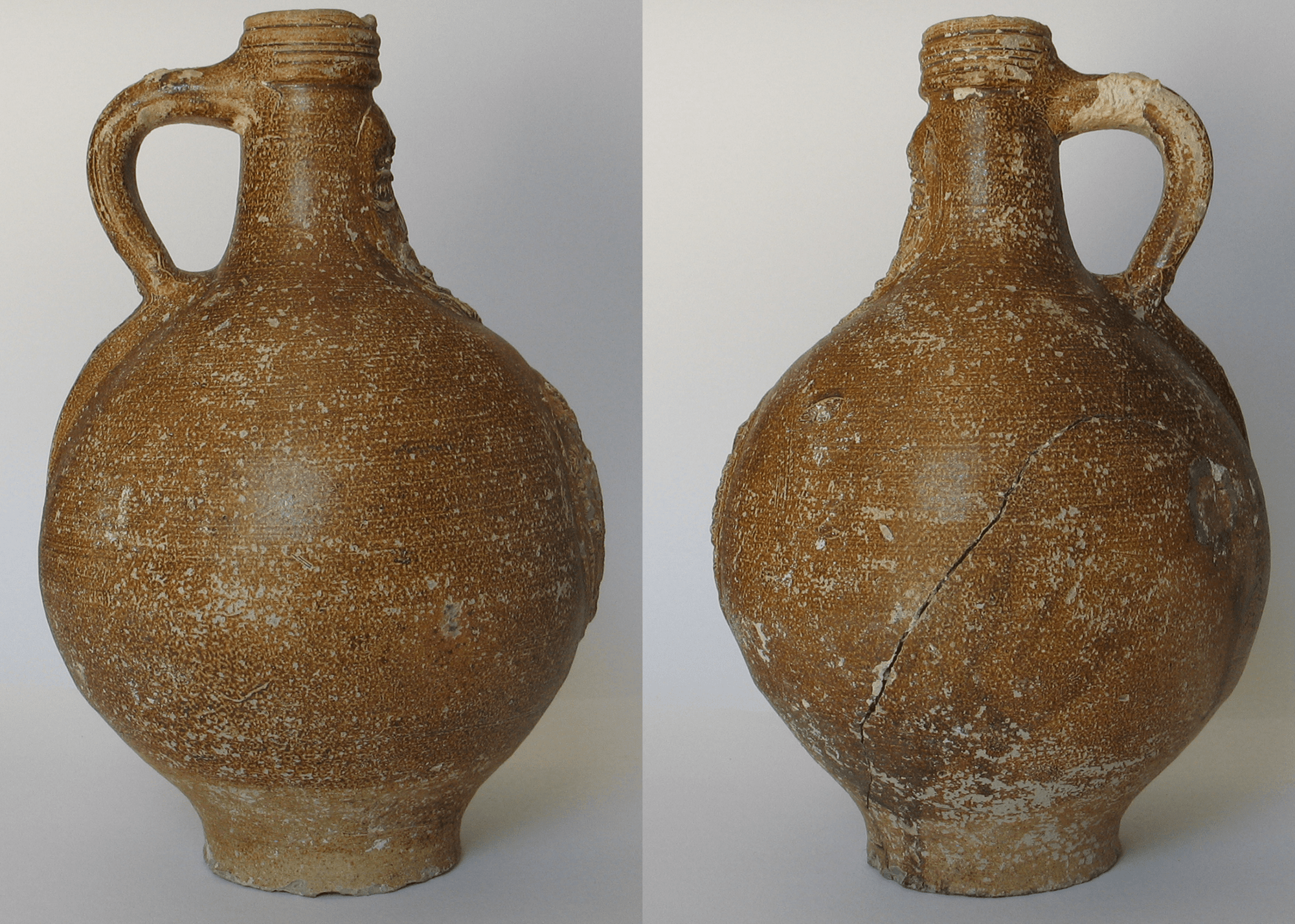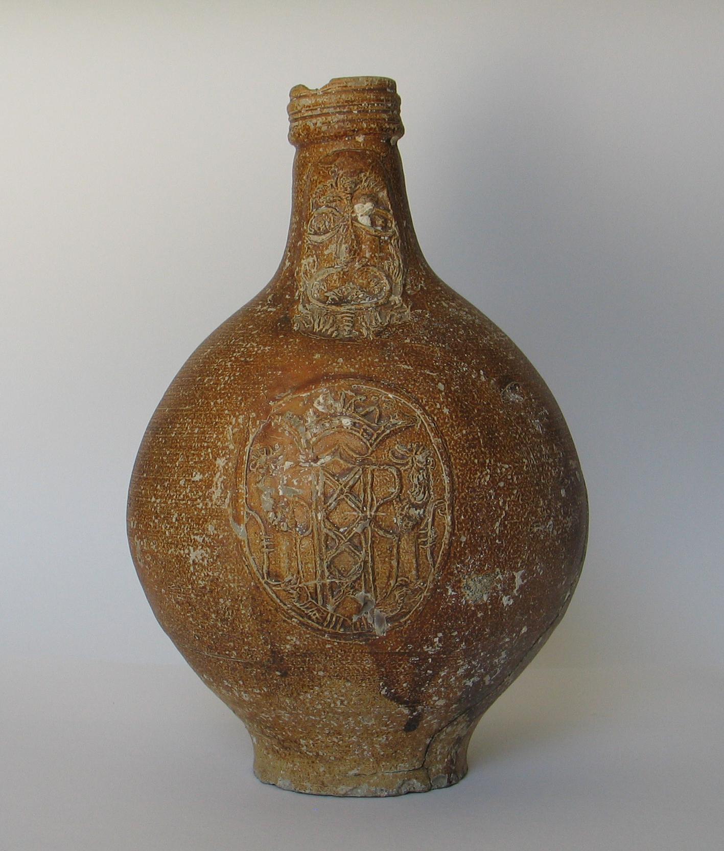 Feature description: Complete stoneware Bartmann jug with a globular body, flat base, and narrow neck. The facemask displays distorted facial features characteristic of 17th-century Frechen production. The vessel is further decorated with the coat of arms of the city of Amsterdam applied to the body.