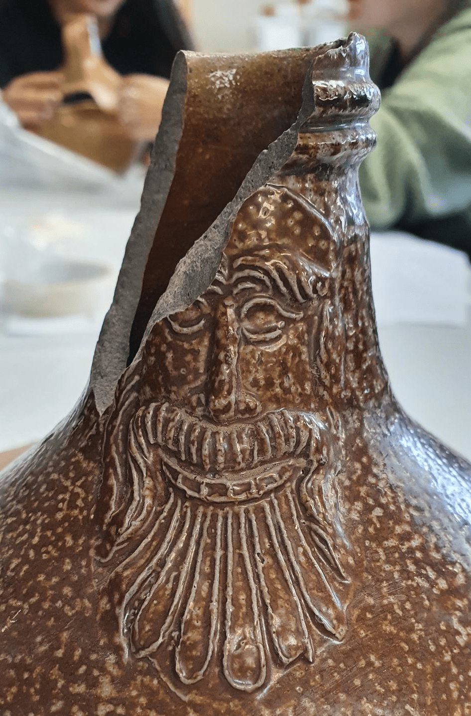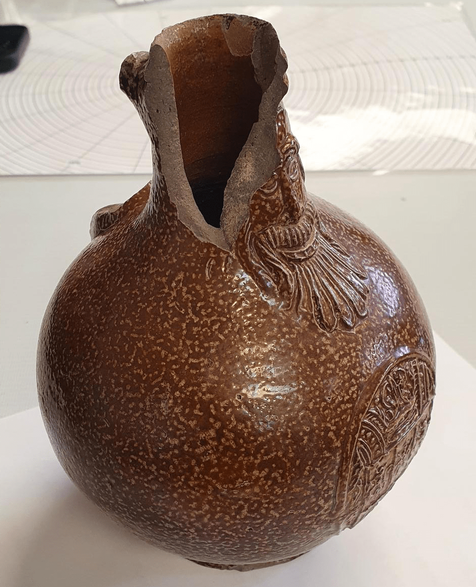 Feature description: The mask has features of group 8 and group 11. There is a kiln mark on the left of the medallion, which proves that the jug touched another jug in the kiln. The handle is missing..