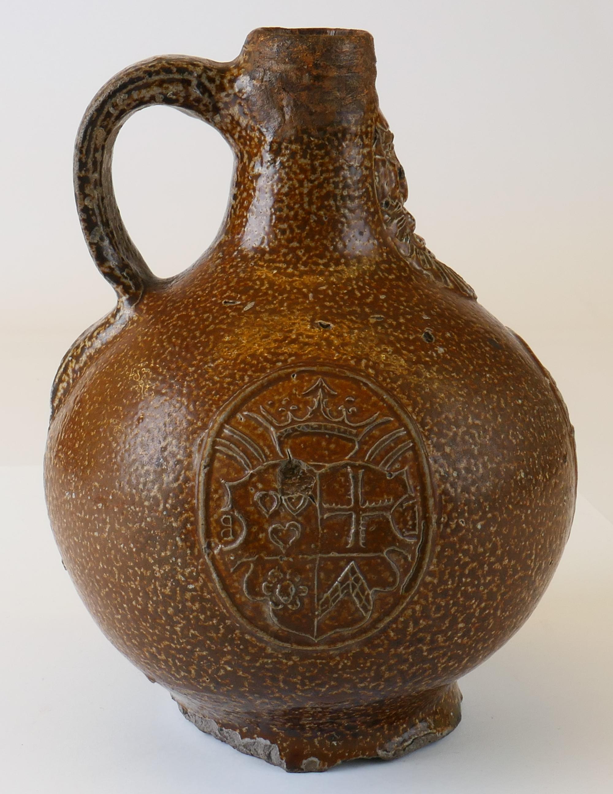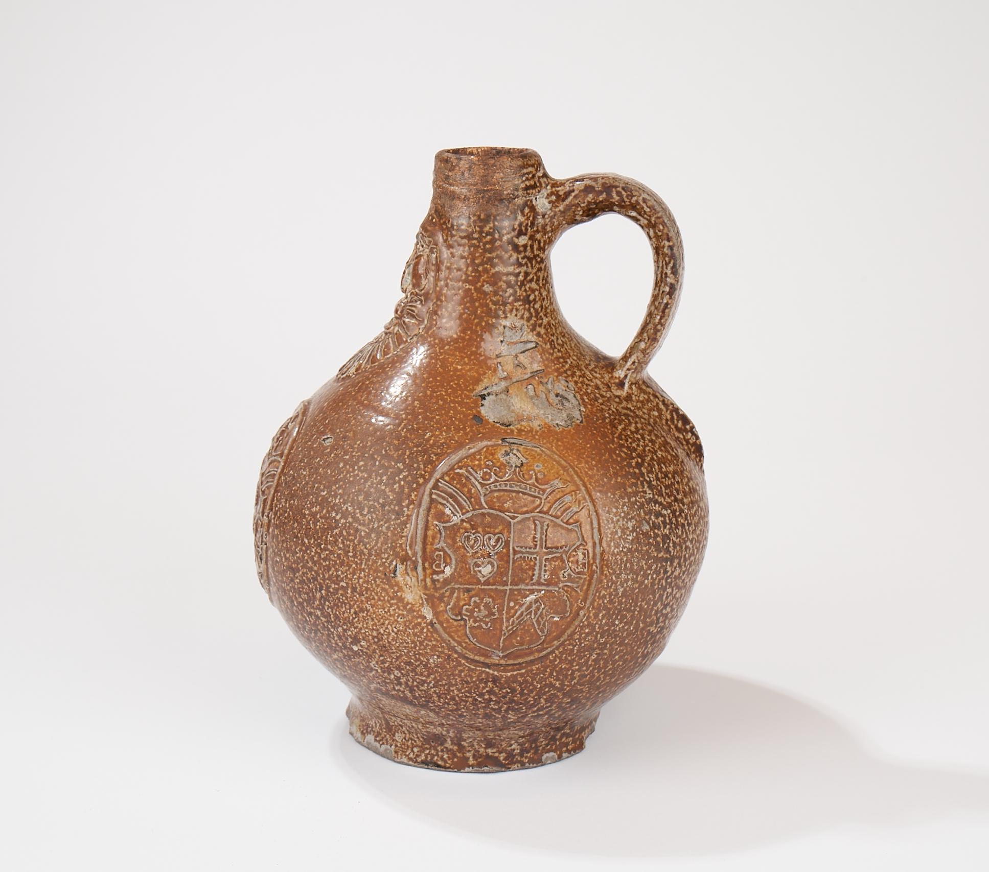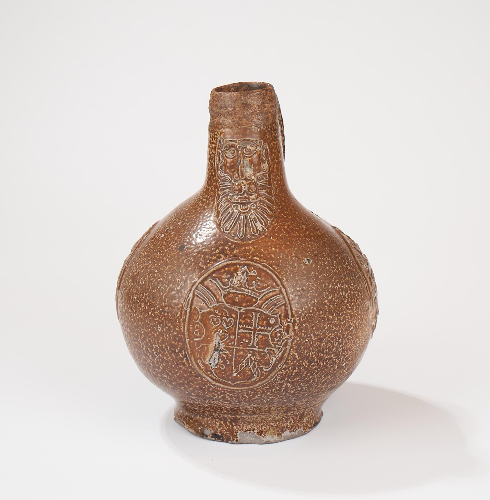 Feature description: Bartmann jug with a mask on the neck and three identical coats of arms on the belly. The coat of arms consists of four sections: three hearts at the top left, a cross at the top right, a rosette at the bottom left, and an inverted V at the bottom right. To the left and right of the coat of arms is what appears to be a letter. It seems to be an E and a B in mirror image.