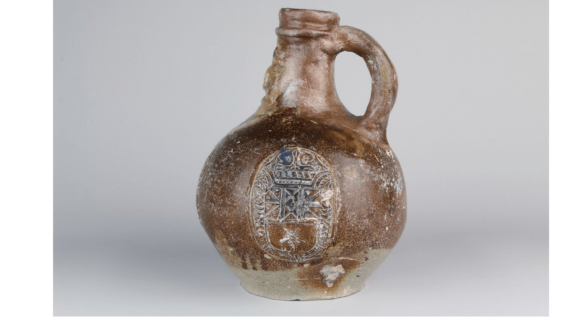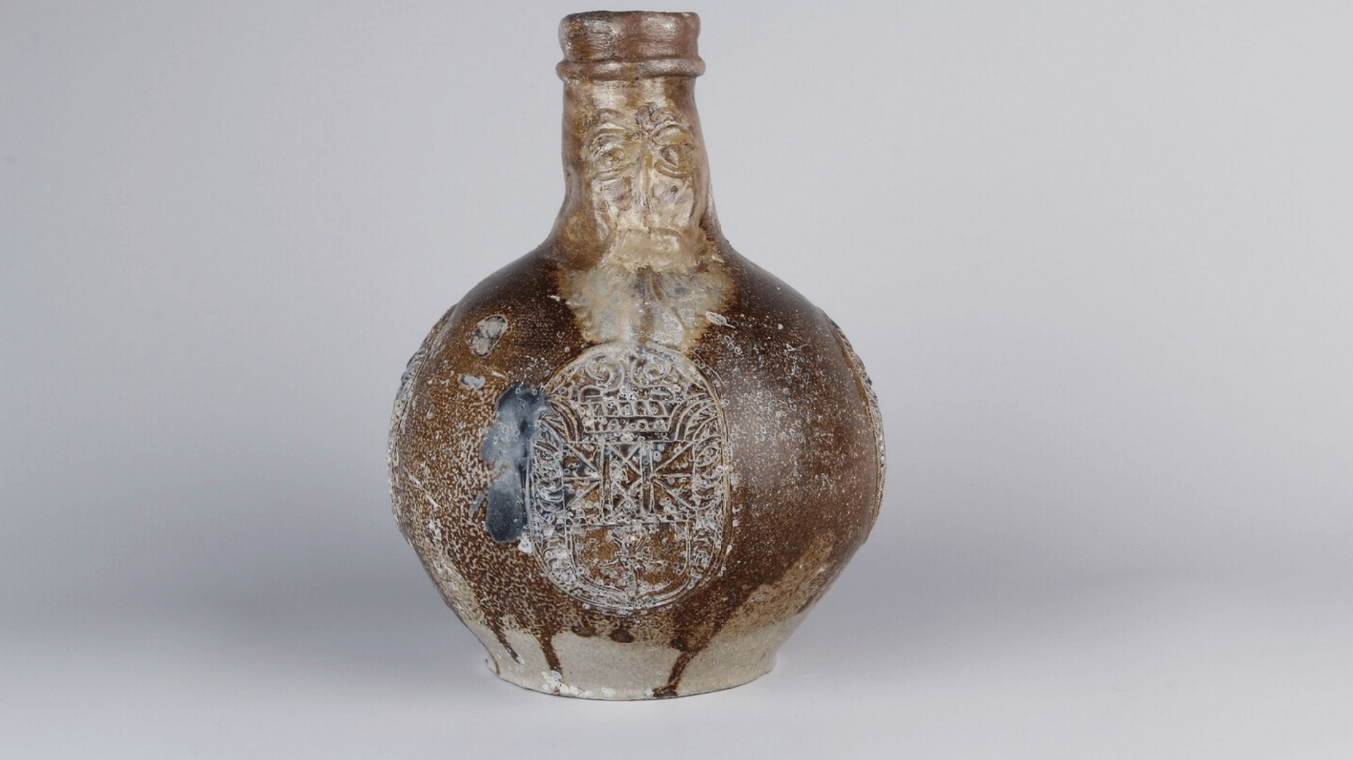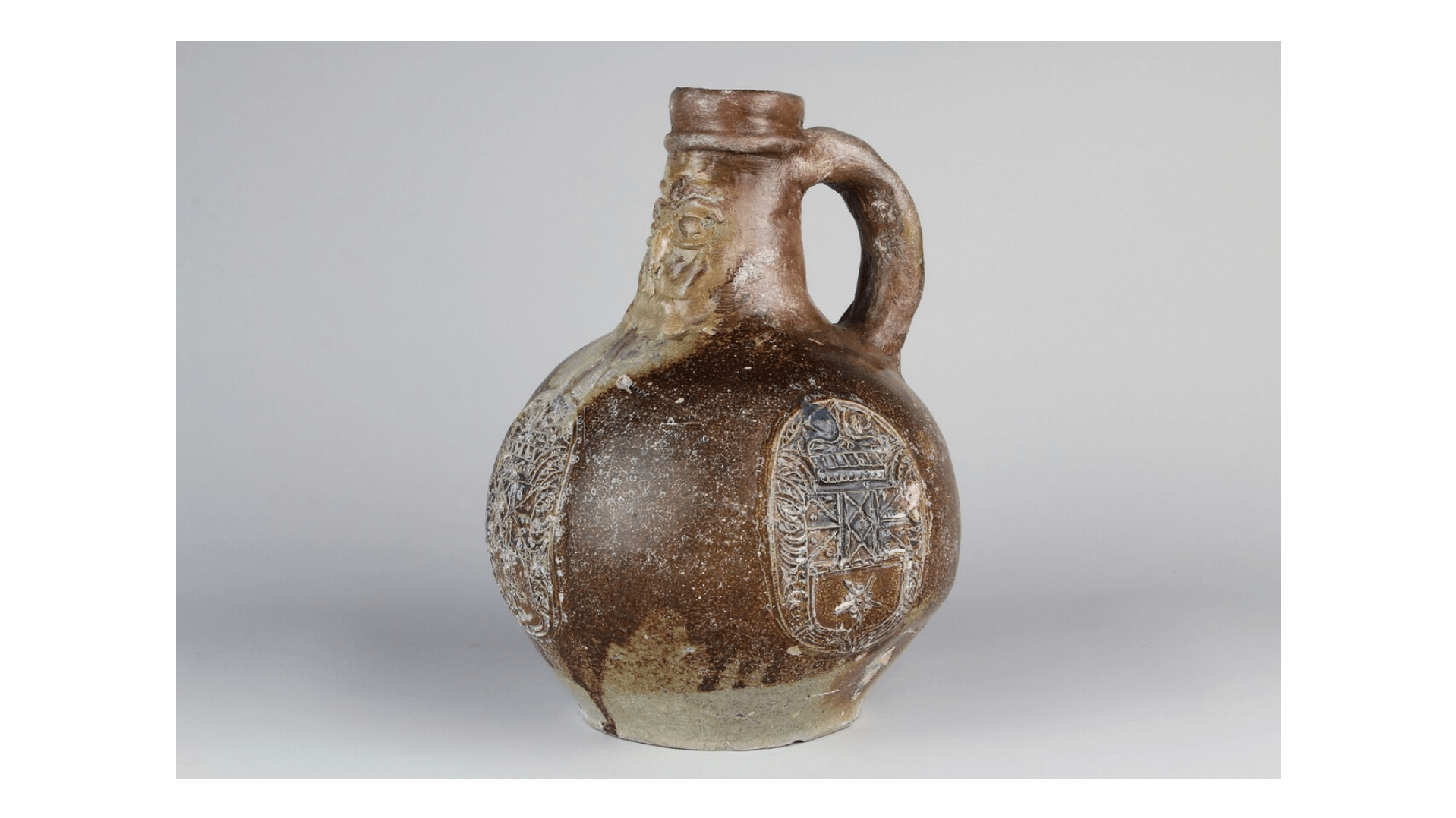 Feature description: Bartmann jug with mask and three medallions.