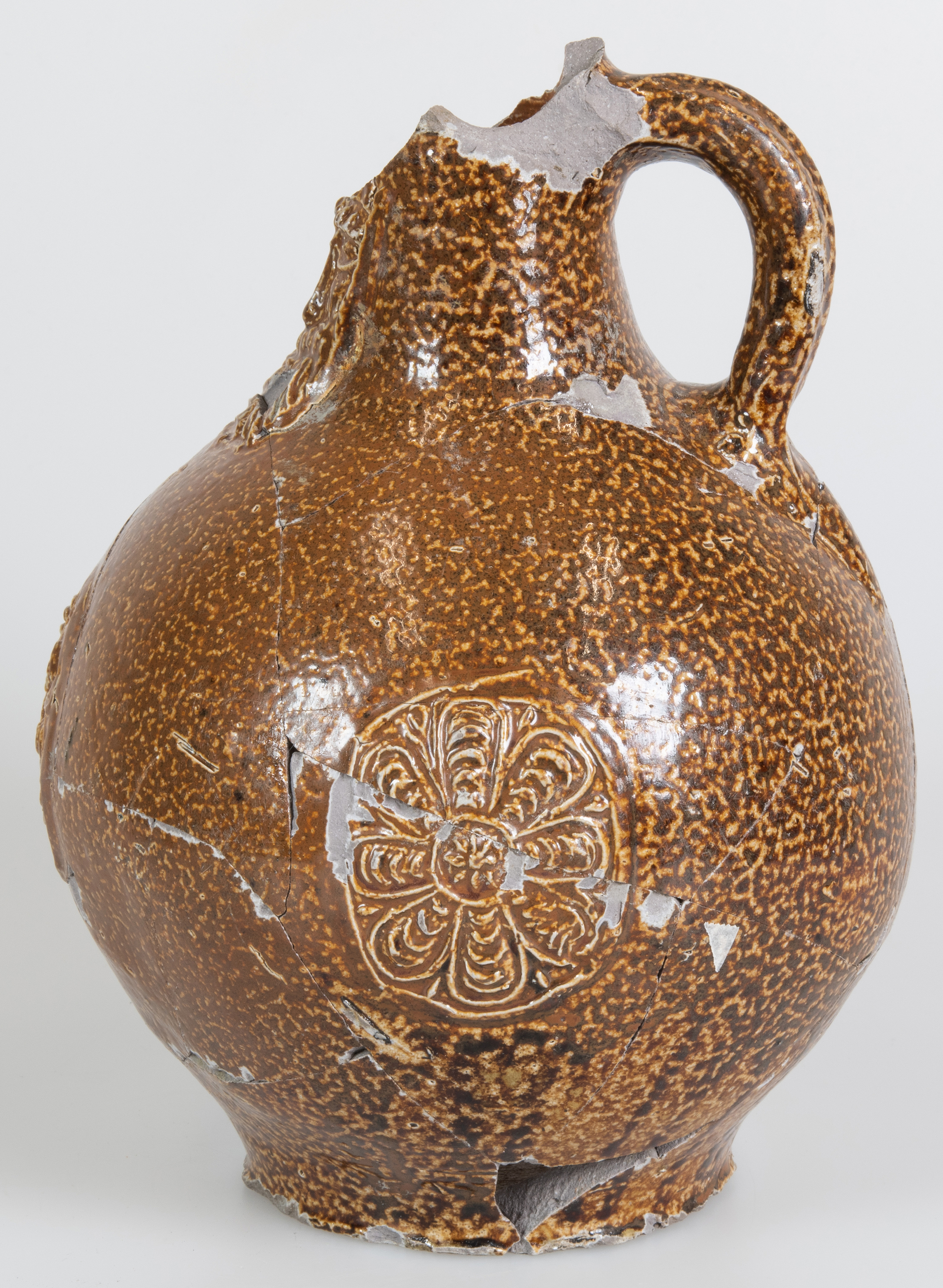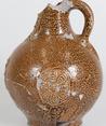 Feature description: Bartmann jug; s2-kan-32; convex jug with shoulder transitioning into a high neck with ribbed collar edge, flat base, vertical ribbon handle; stoneware with surface treatment: iron engobe, salt glaze; appliqués: mask on neck; three rosettes on belly; origin: Frechen, Germany.