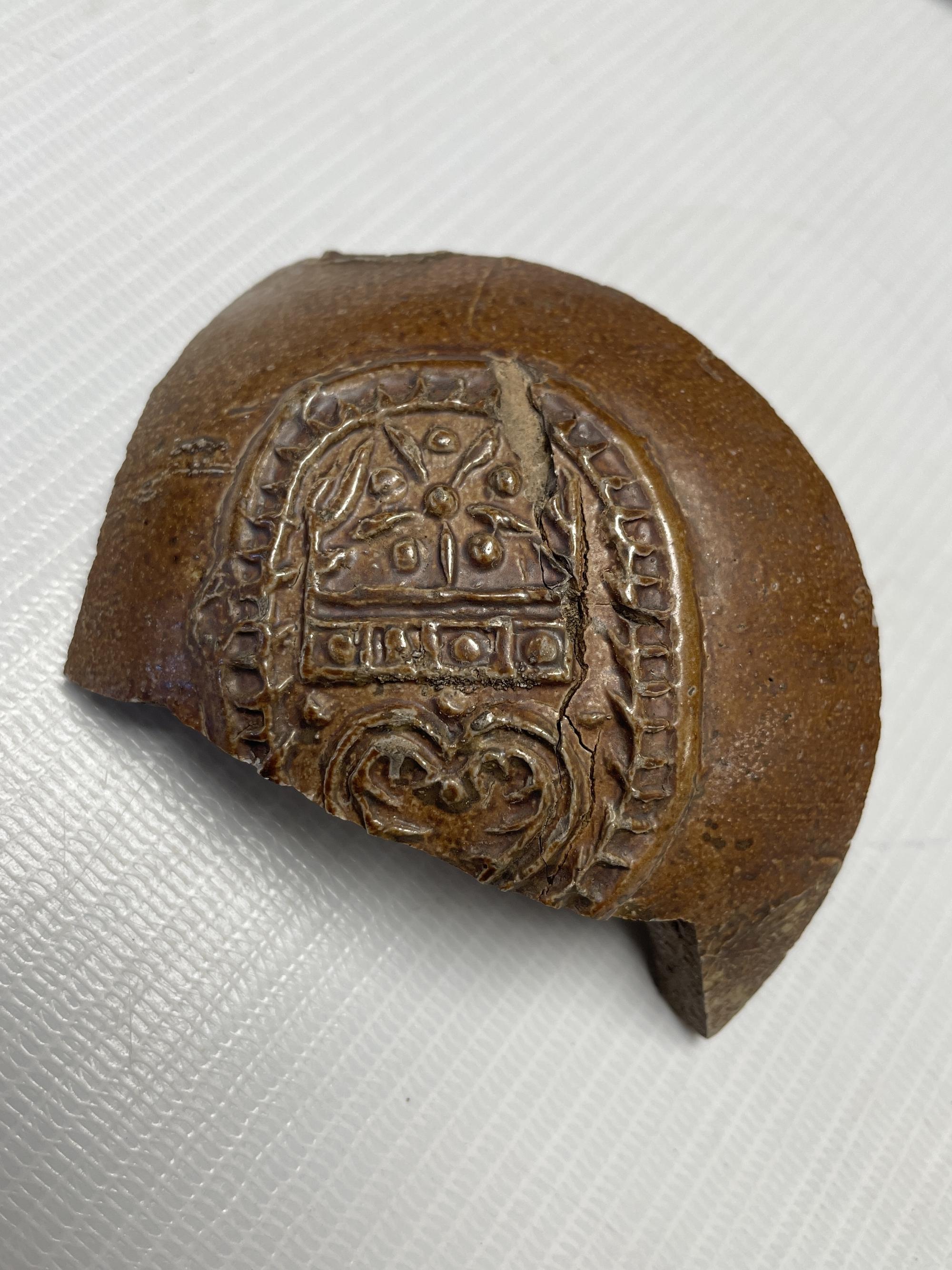 About this jug Medallion: craftsman's brand / imaginary coat of arms Location: 111 Charing Cross Rd, London WC2H 0DT, United Kingdom Long/Lat: 51.5145439, -0.1299938 Archaeological Context: Sealed feature: An archaeological feature Site type: Urban landscape Time Period: 1650 - 1700 Identifier: CHX16-118 Custody: Museum Custody Data: MOLA