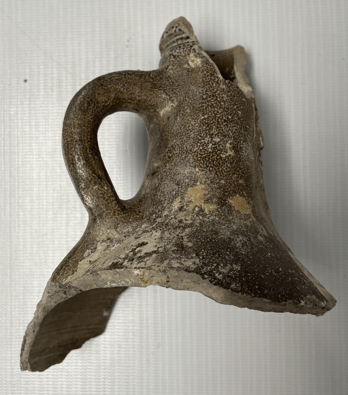Transcription: Just one fragment of the jug is preserved. The sherd has a preserved face and handle. The rim is incomplete
