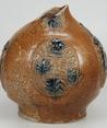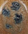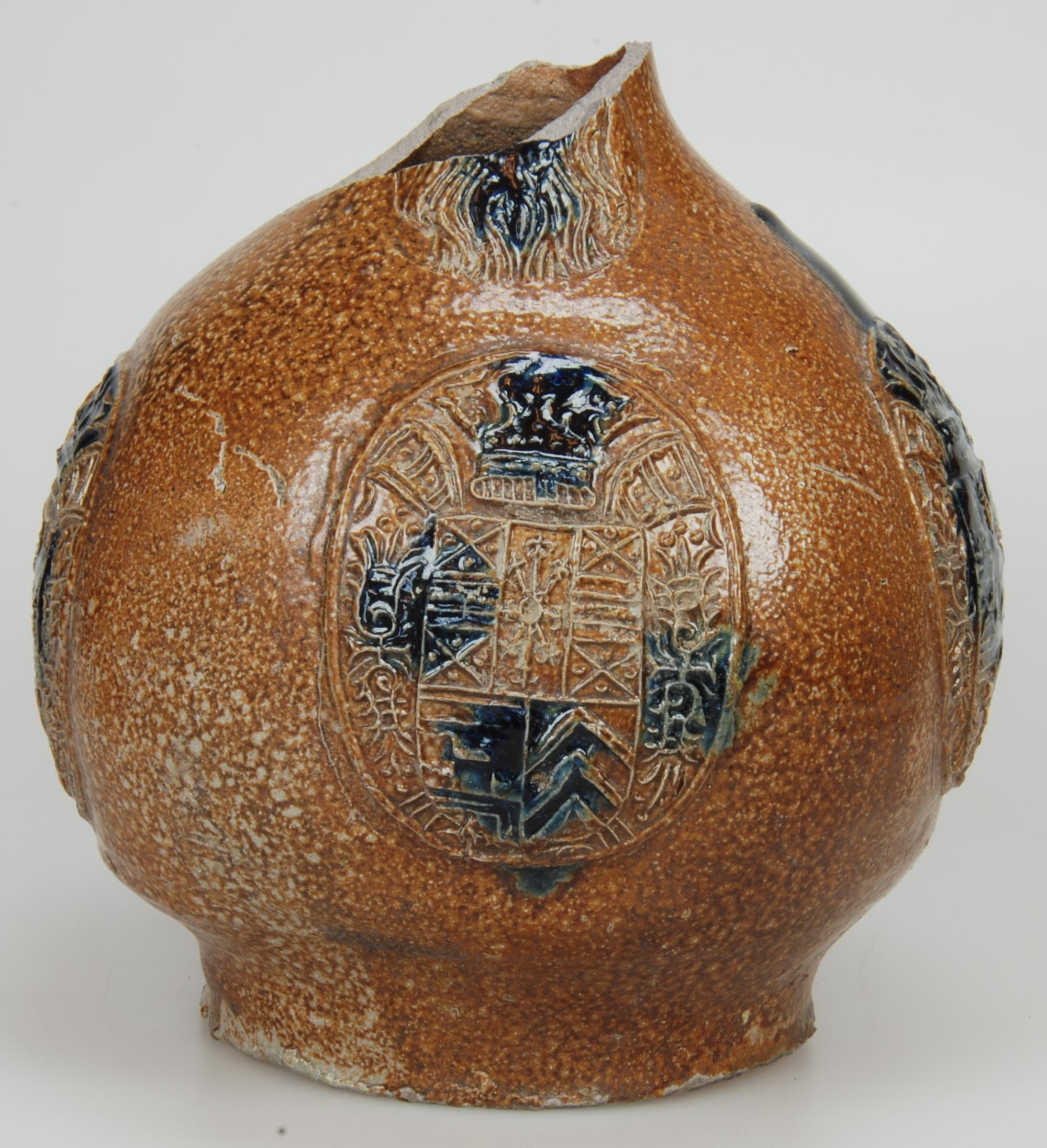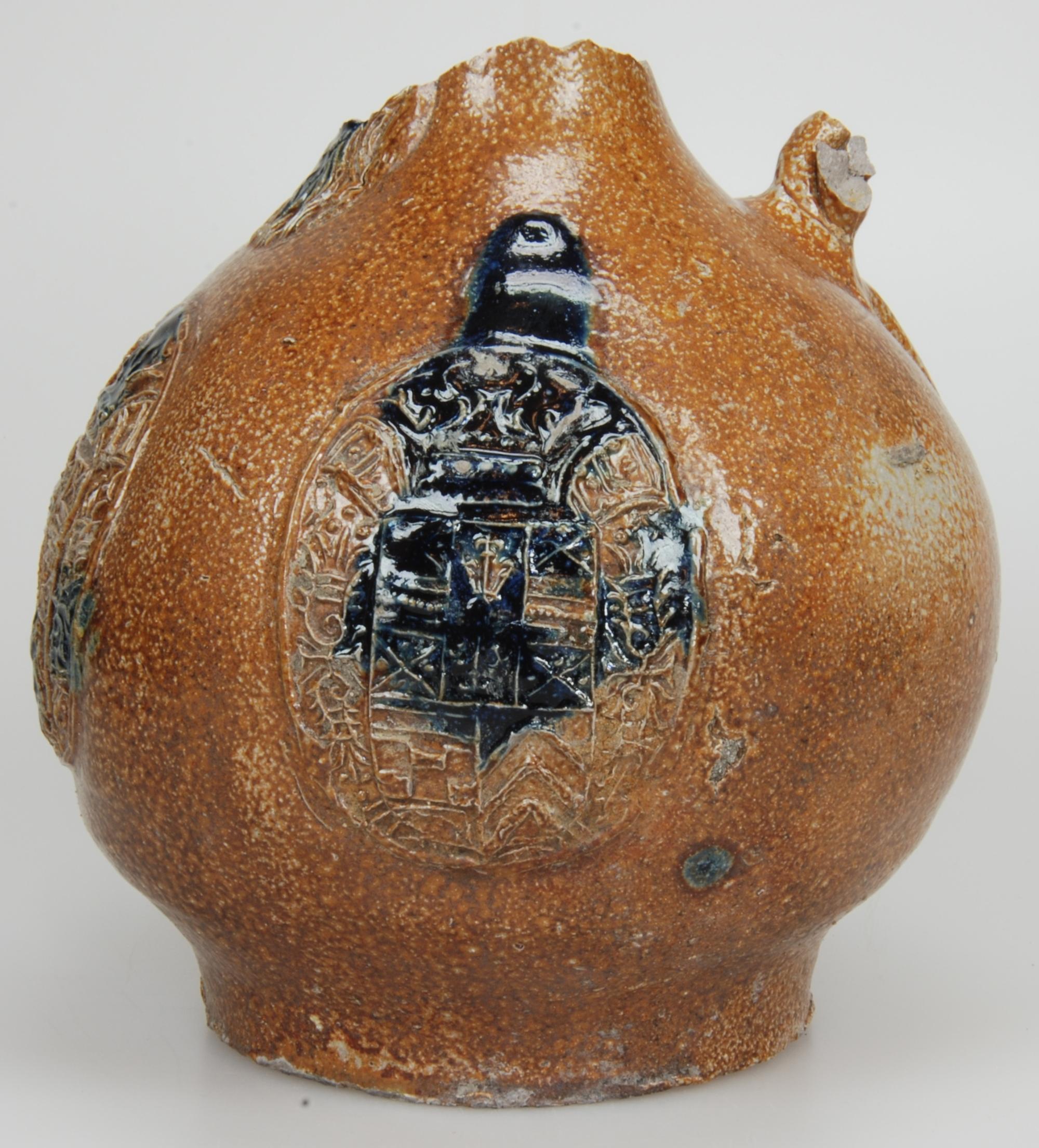 Feature description: Bartmann jug; s2-kan-32; convex jug with shoulder transitioning into a high neck, flat base, ribbon handle (missing); stoneware with surface treatment: iron engobe and accents of cobalt oxide, salt glaze; appliqués: mask on neck and three medallions on belly with crowned coat of arms: resembles the coat of arms of Gulik-Kleef-Berg; origin: Frechen, Germany.