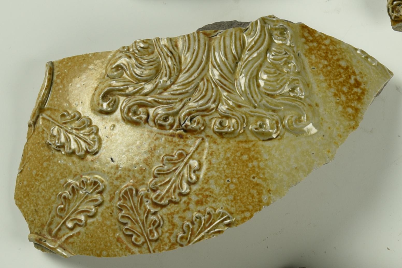 Feature description: Fragment of a beard jug. A large part of the beard and a number of oak leaves are visible. Made in Cologne or Frechen.