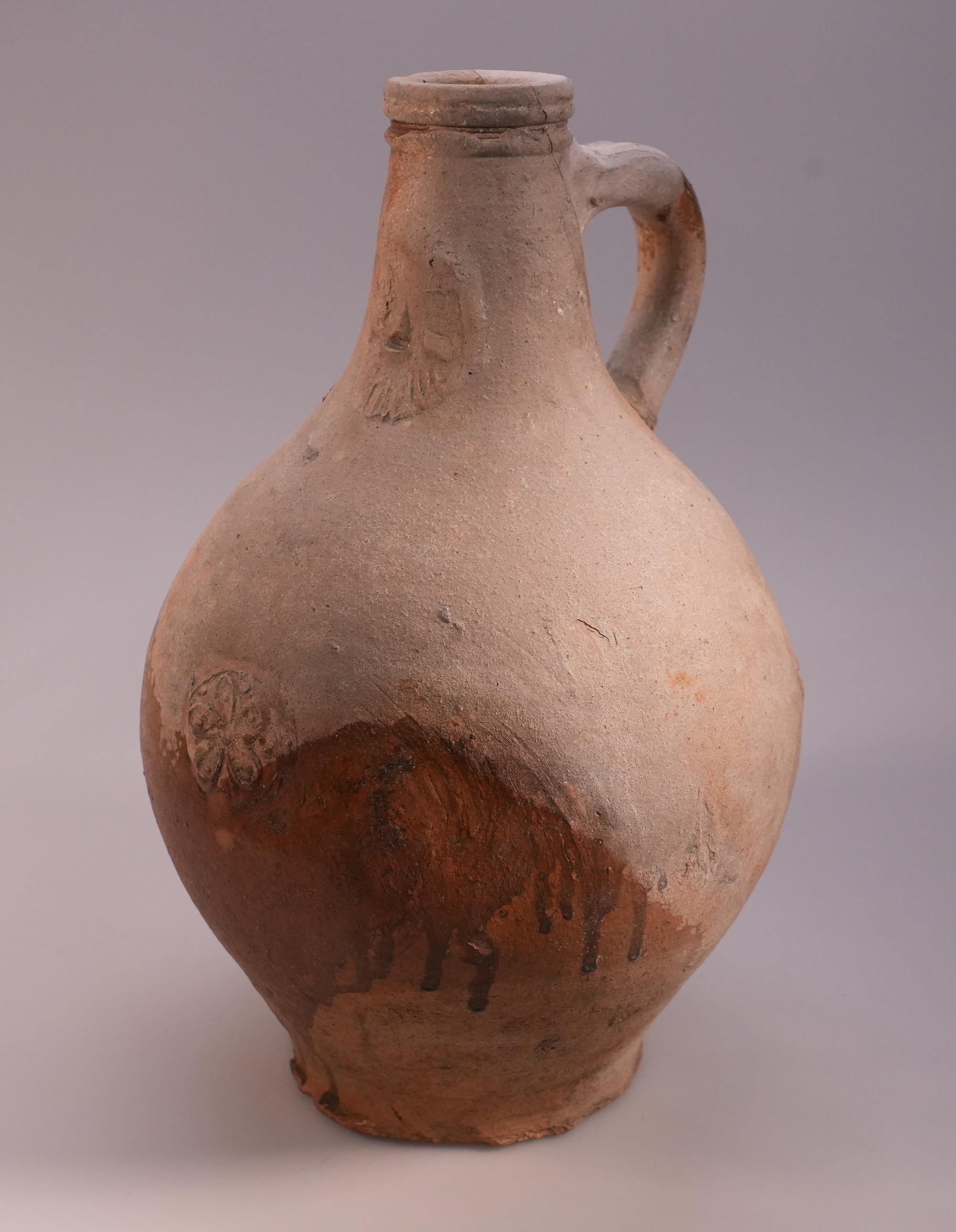 Feature description: The upper half of the bartmann jug is unglazed. Medallion with floral motif on the belly.
