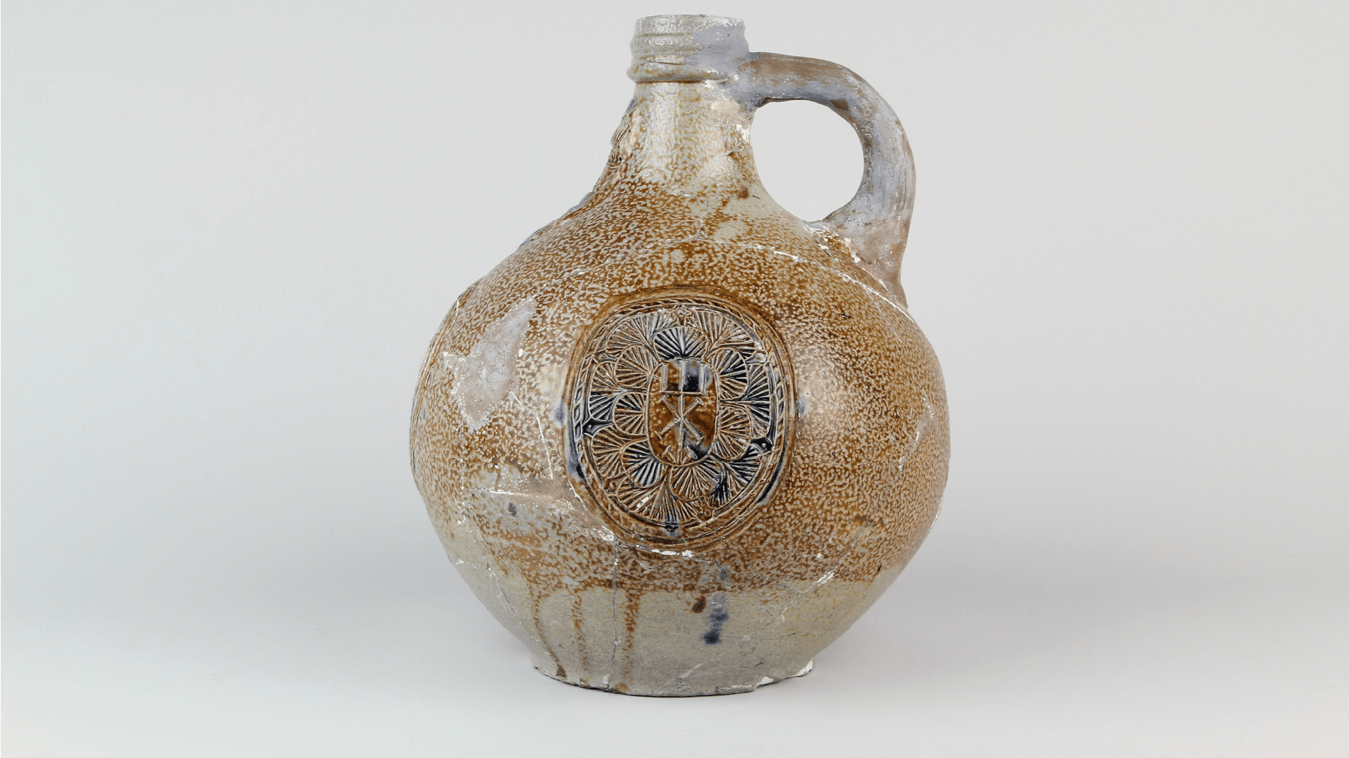 Feature description: Bartmann jug with mask and medaillons. In the centre of the medaillons a craftman's brand surrounded by a floral motif.