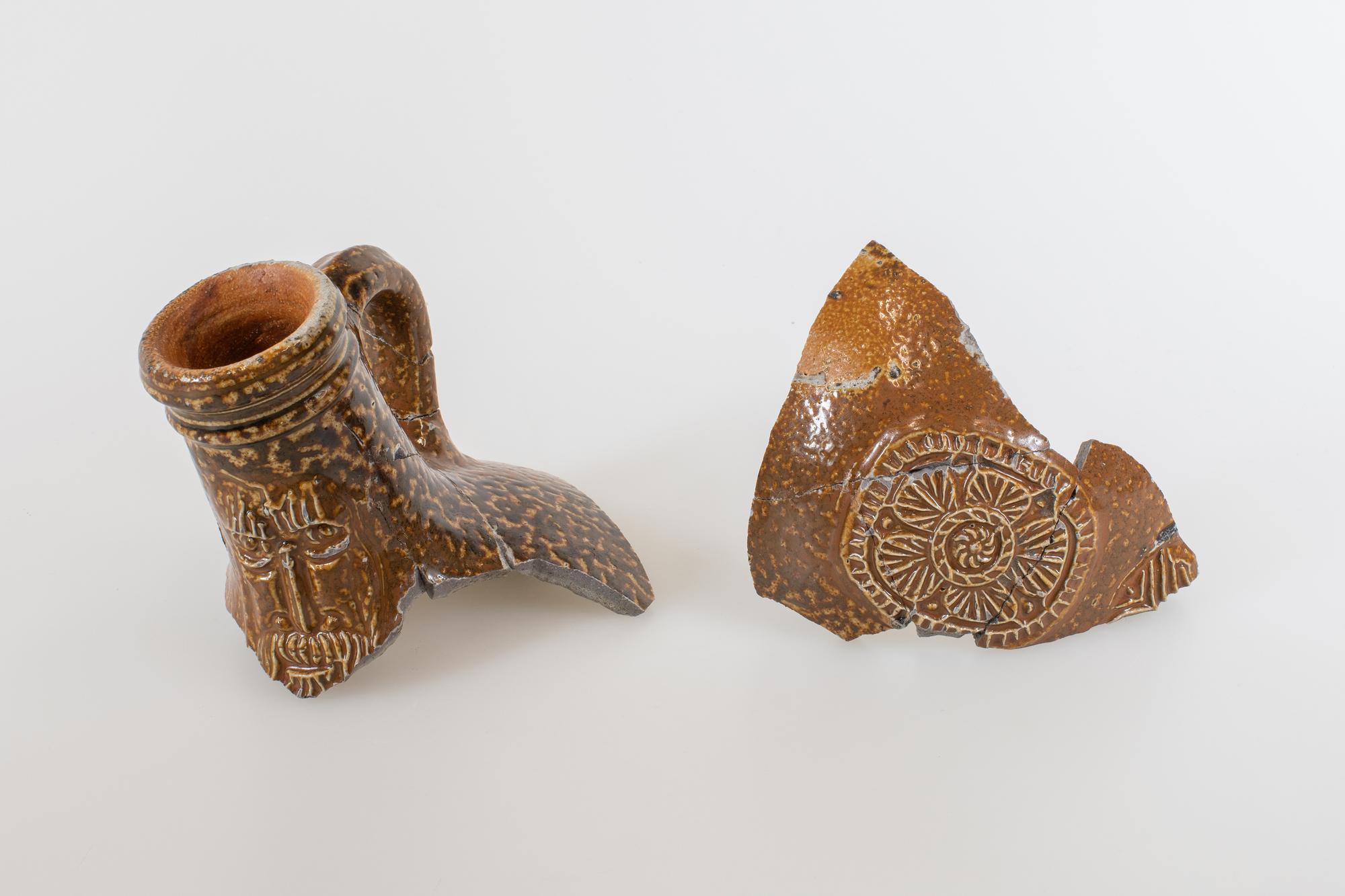 Feature description: Barmann jug (rim and wall fragment); s2-kan-32; convex jug with shoulder transitioning into a high neck with ribbed collar rim, ribbon handle; stoneware with surface treatment: iron engobe, salt glaze; mask on neck and rosette on belly; origin: Frechen, Germany
