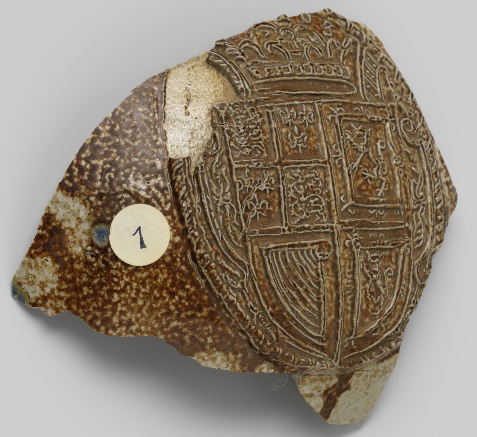 Feature description: Royal Coat of Arms of the Kingdom Scotland. Shield is crowned and is divided into four quadrants. First quadrant is the English coat of arms, three lions passant in first and fourth quadrant, three fleur de lis in the second and third quadrant. Second and fourth quadrant is the rampant lion of Scotland, and third quadrant is the harp of Ireland.
