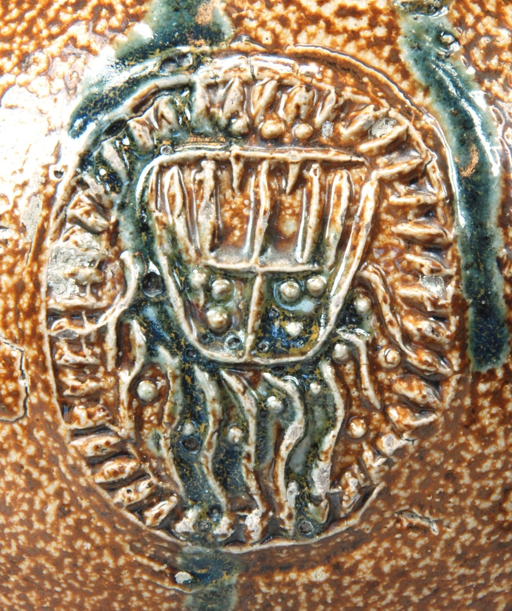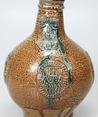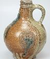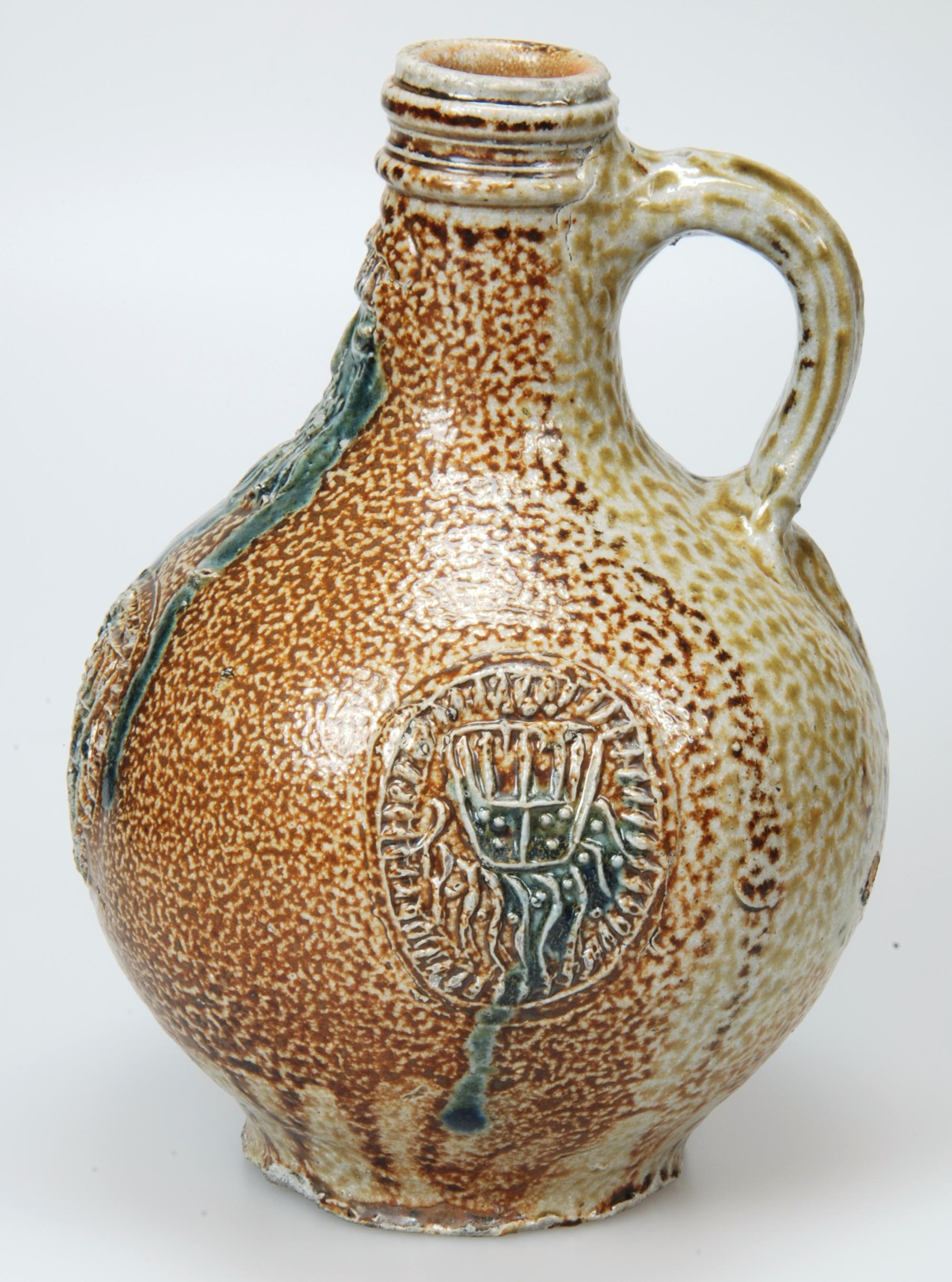 Feature description: Bartmann jug; s2-kan-32; convex jug with shoulder transitioning into a high neck with ribbed collar edge, flat base; vertical ribbon handle; stoneware with surface treatment: iron engobe and accents of cobalt oxide, salt glaze; appliqués: mask on neck and three medallions with stylised coats of arms on belly; origin: Frechen, Germany