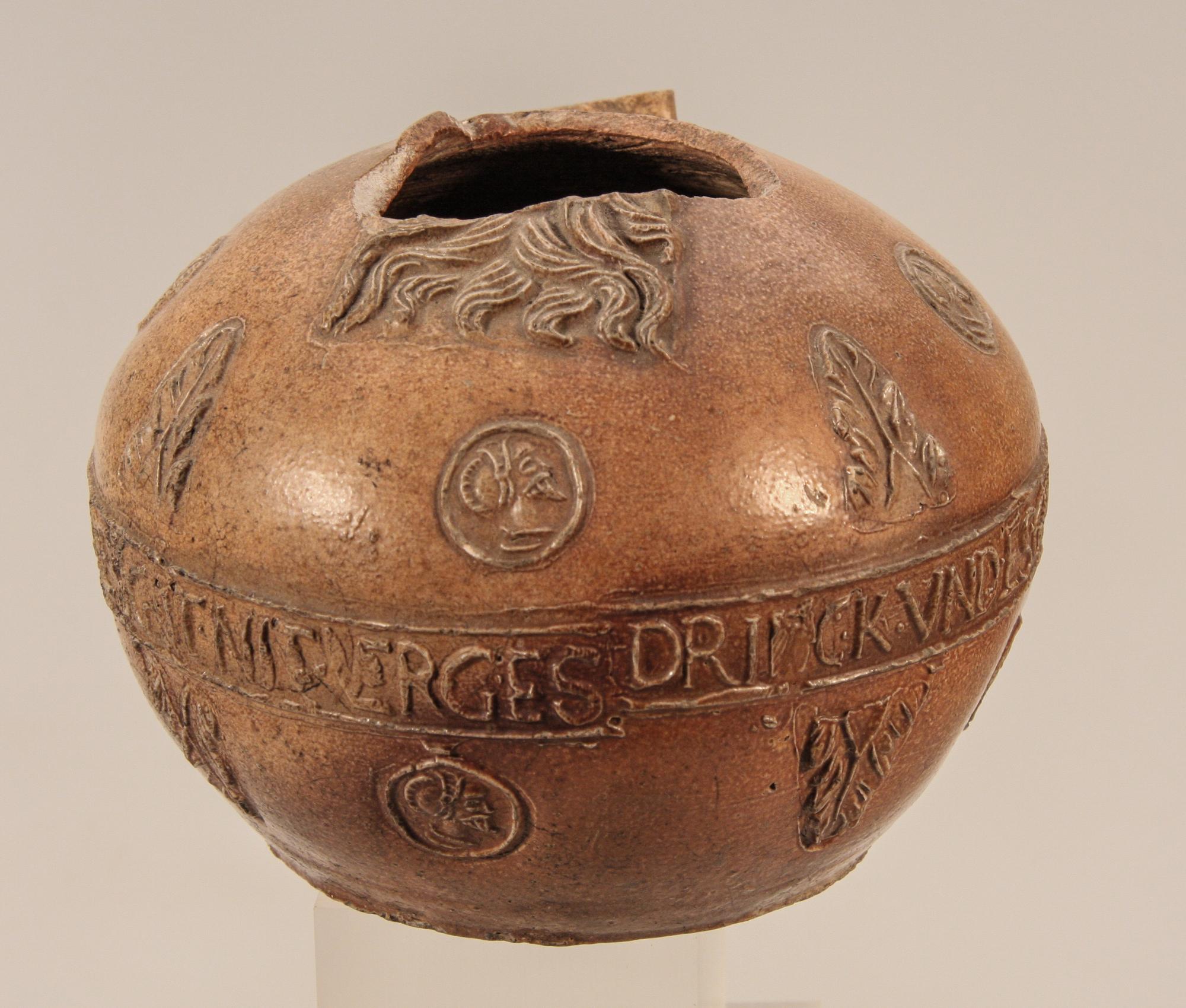 Feature description: Damaged bartmann jug with portrait medallions, acanthus leaves, and the inscription “DRINCK VND ES GOT NIT VERGES.” Probably from Cologne or Frechen. (Ligature of V and E)