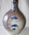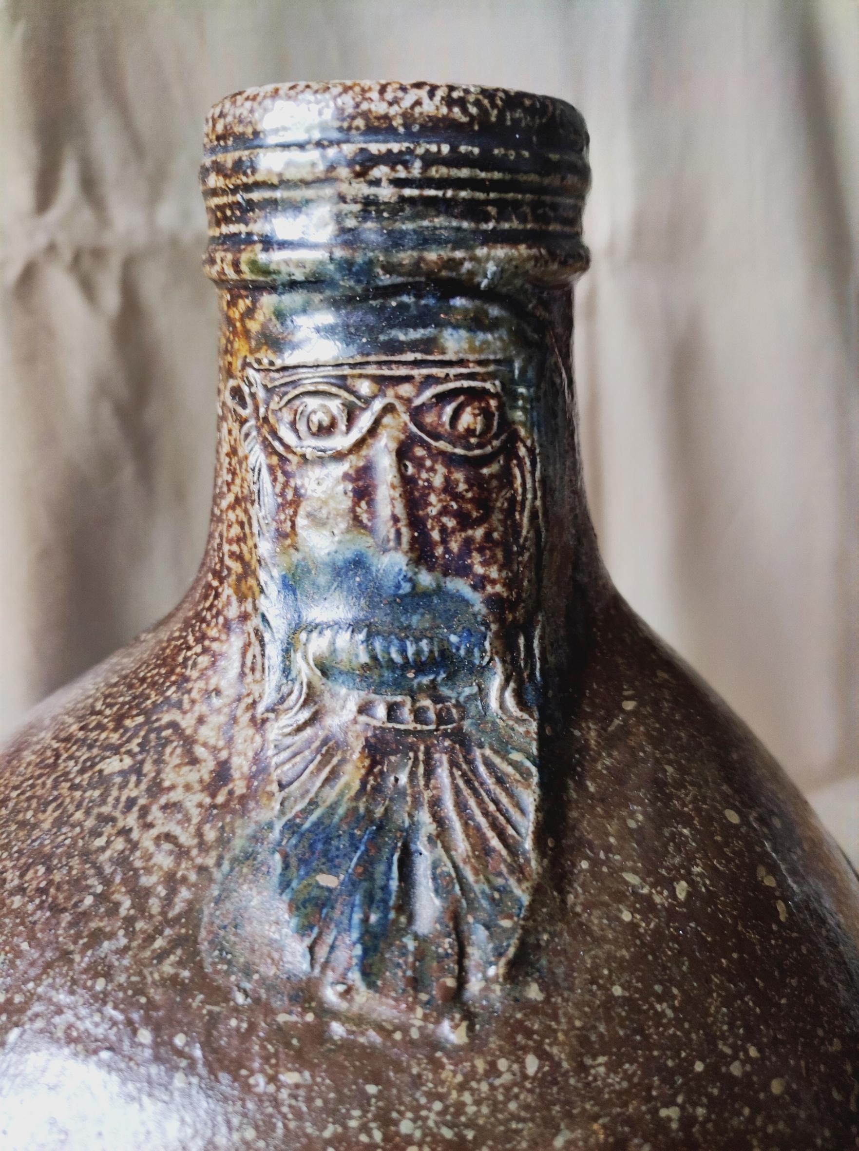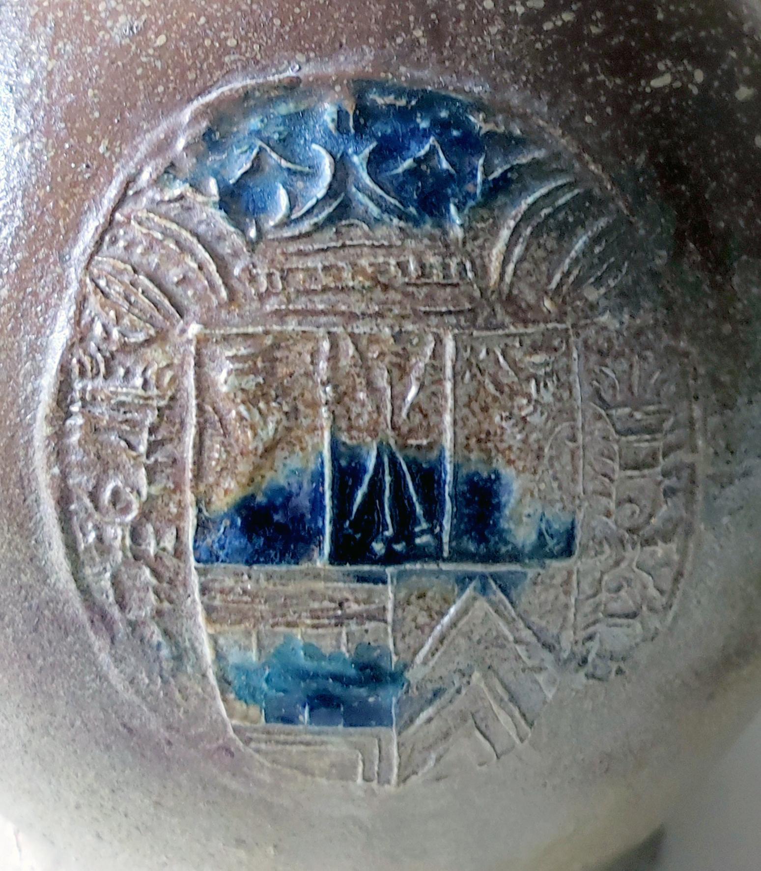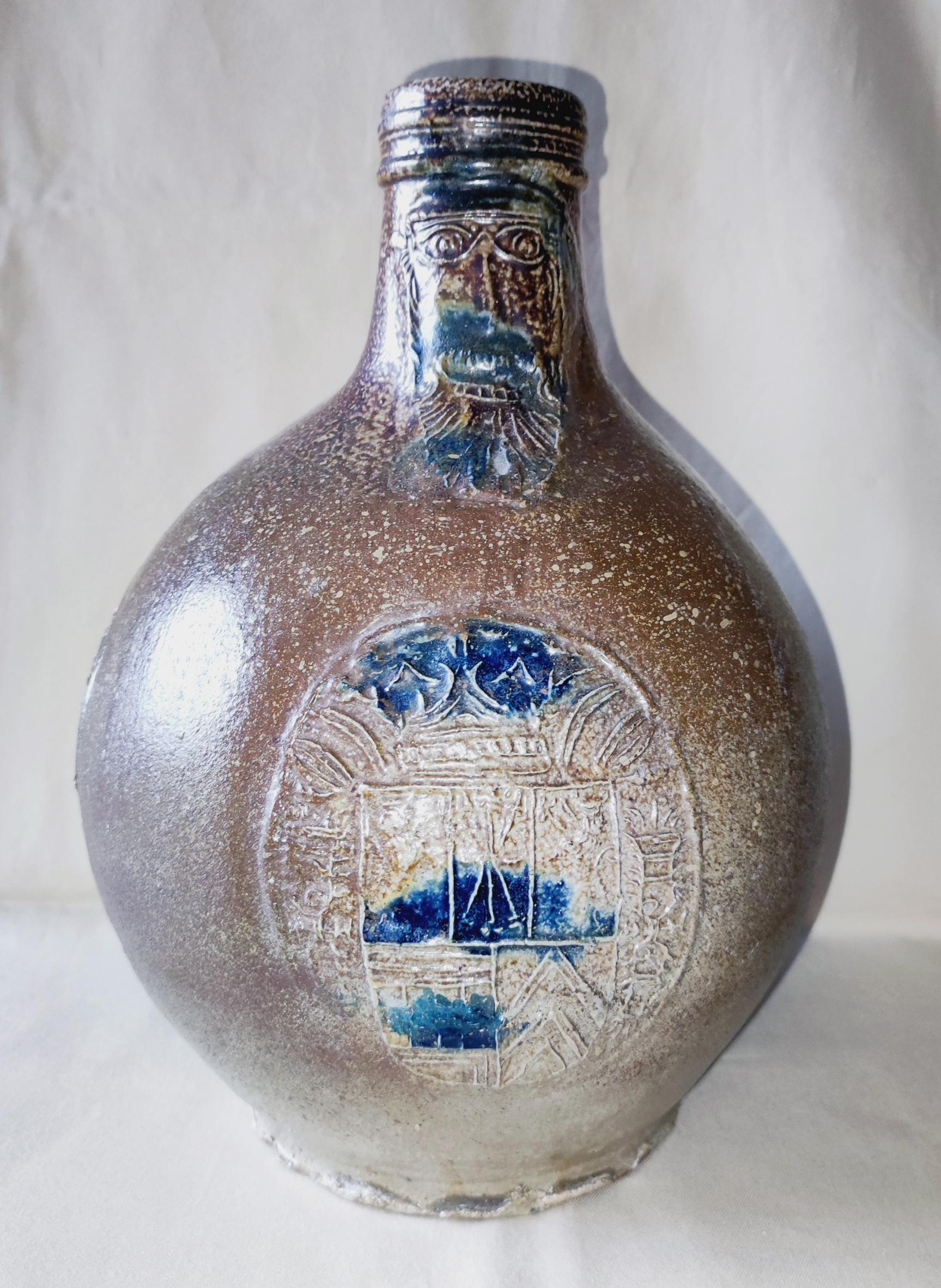 Feature description: Bartmann jug; convex jug with shoulder transitioning into a high neck with ribbed collar edge, flat base, vertical ribbon handle; stoneware with surface treatment: iron engobe, accents of cobalt blue and salt glaze; mask on the neck, three identical appliqués with the coats of arms of Jülich, Kleve, Berg, Mark and Ravensberg on the belly; cobalt blue spots on the appliqués; origin: Frechen, Rhineland; surviving above ground.
