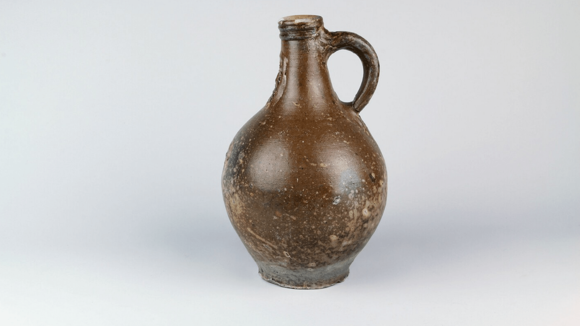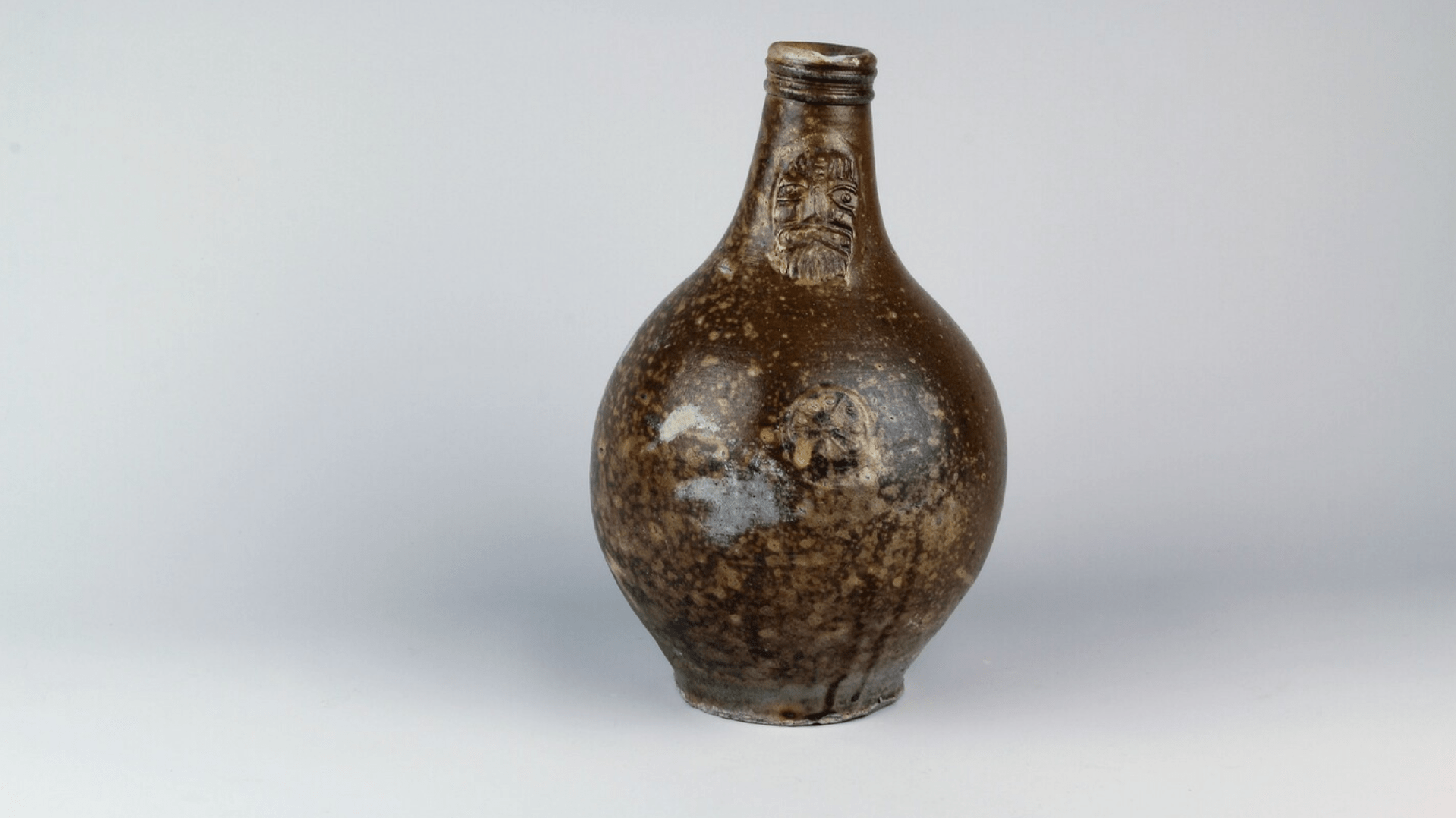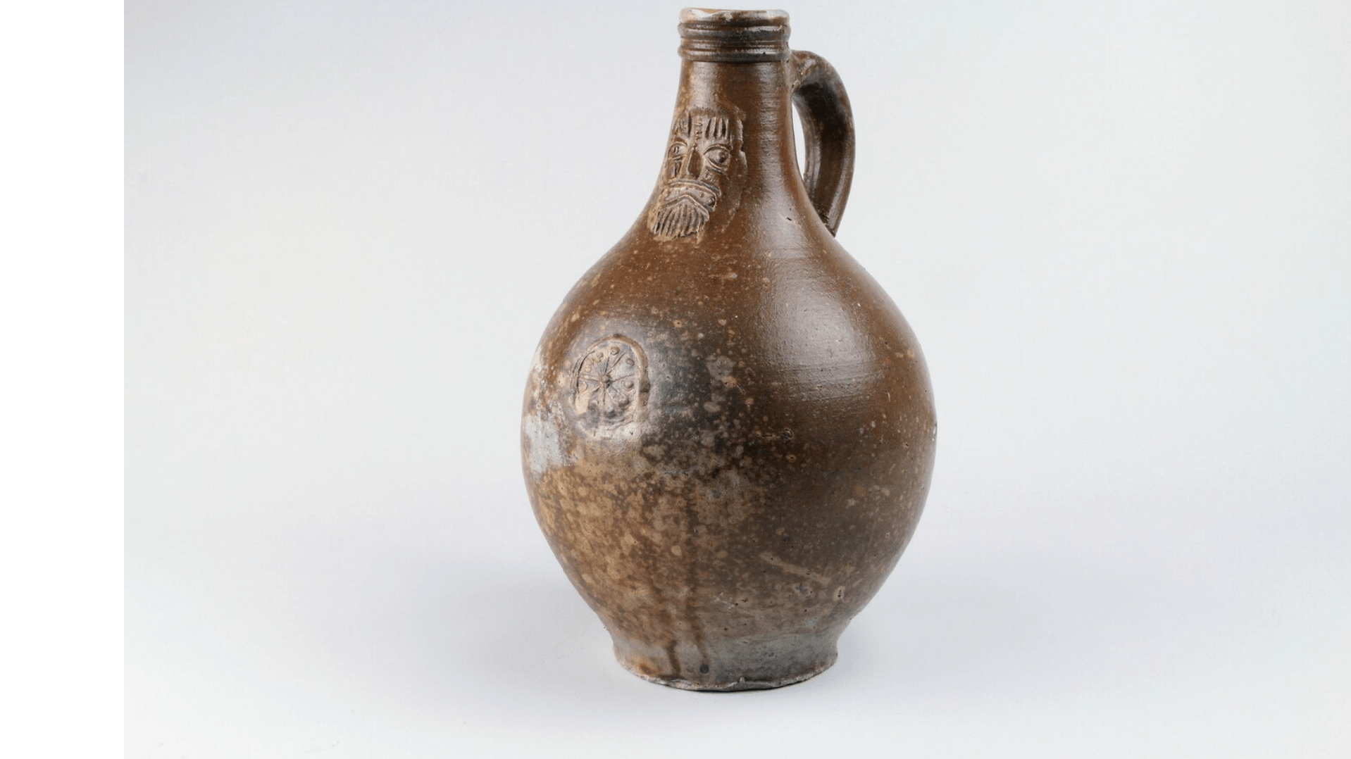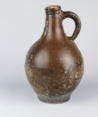 Feature description: German oil or beer pitcher from Stadtlohn/Vreden with mask on neck and flower-shaped medallion on belly (s2-can-32).