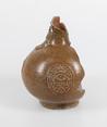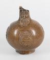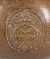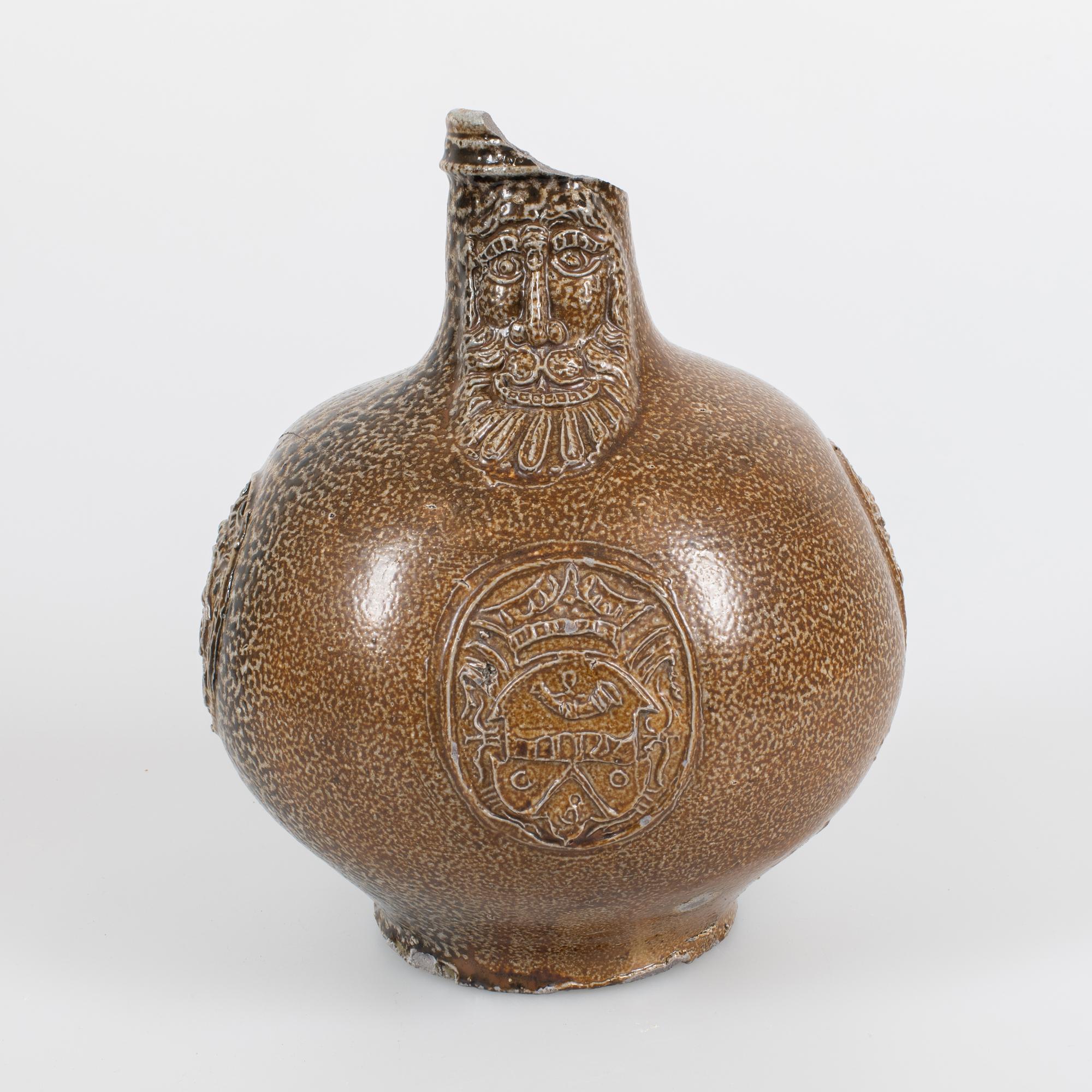 Feature description: Bartmann jug; s2-kan-32; convex jug with shoulder transitioning into a high neck with ribbed collar edge, flat base; stoneware with surface treatment: iron engobe, salt glaze; appliqués: mask on neck and three medallions on belly with crowned coat of arms: hunting horn; origin: Frechen, Germany.