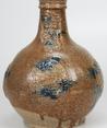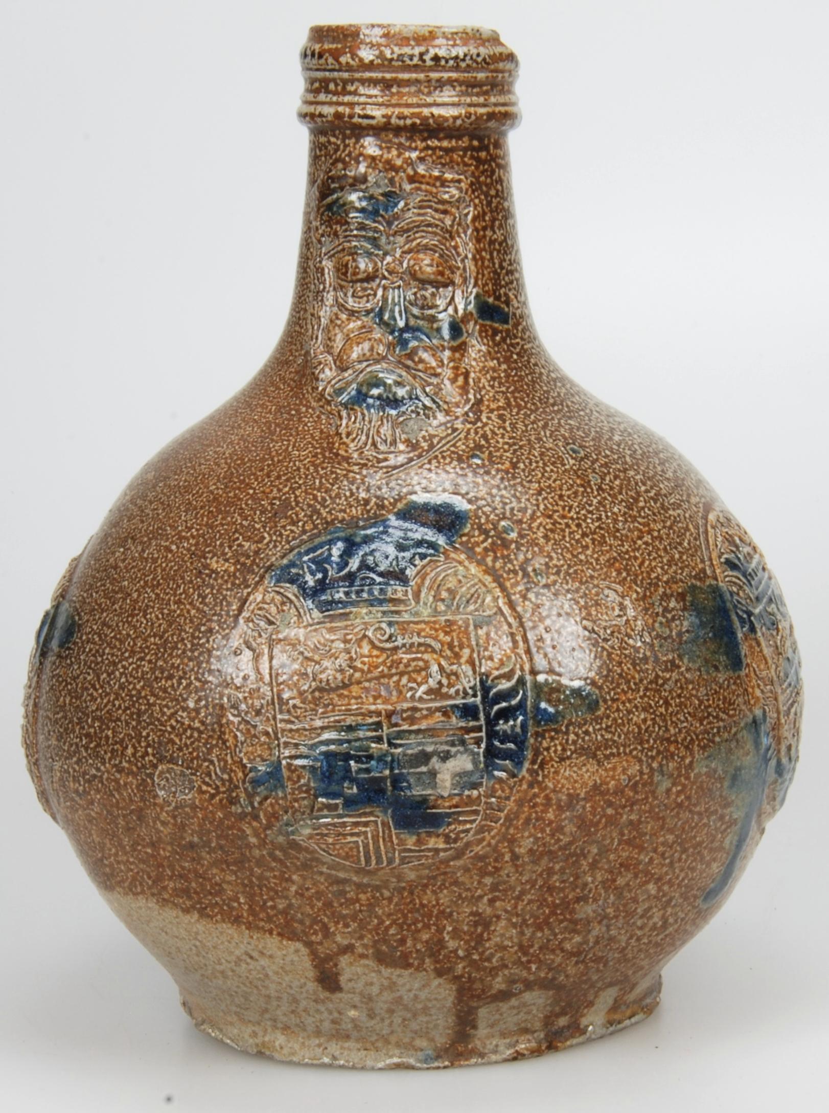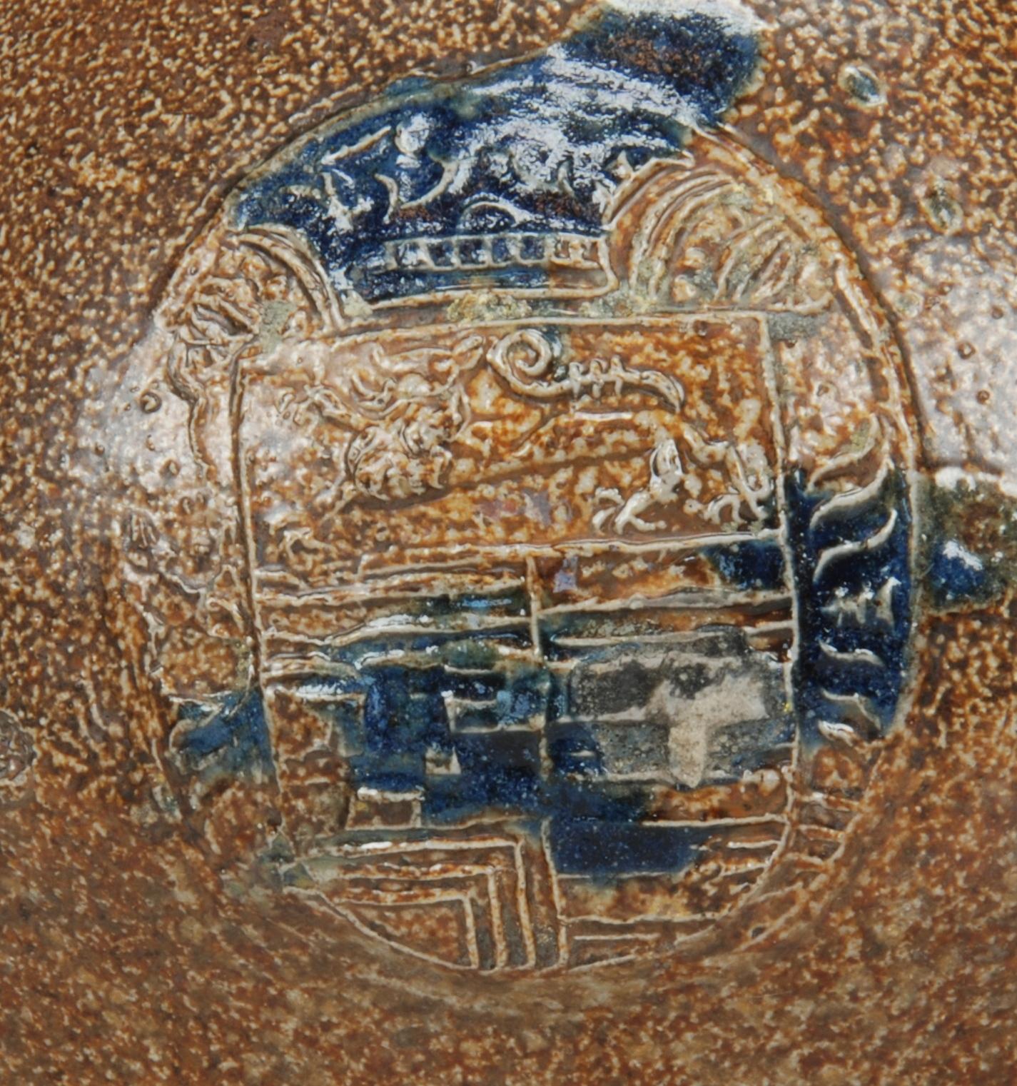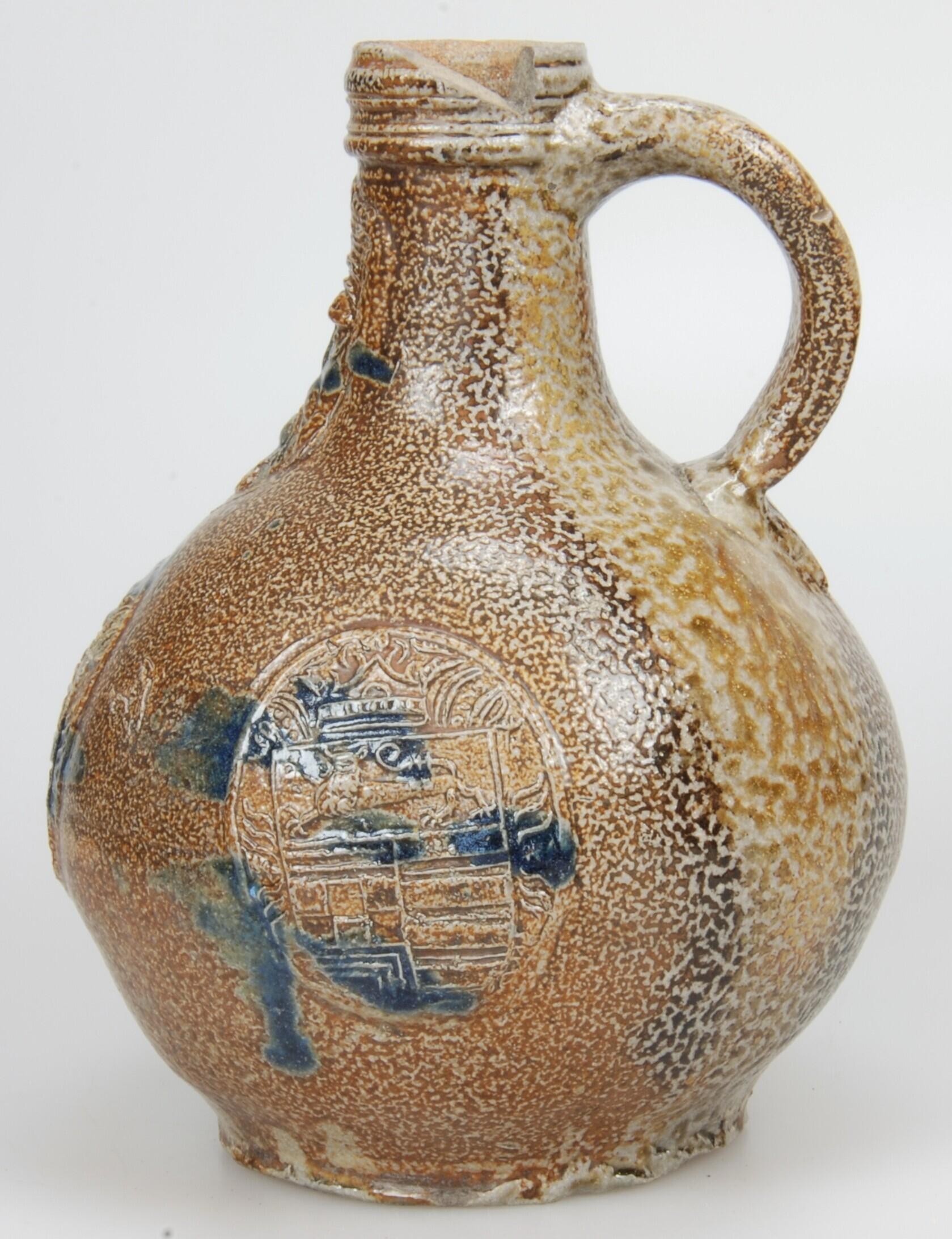Feature description: Bartmann jug; s2-kan-32; convex jug with shoulder transitioning into a high neck with ribbed collar edge, flat base, vertical ribbon handle; stoneware with surface treatment: iron engobe and accents of cobalt oxide, salt glaze; appliqués: mask on neck and three medallions with crowned coats of arms on belly: lion and fields with horizontal bands, coat of arms partly resembles that of Julich-Cleve-Berg; origin: Frechen, Germany.