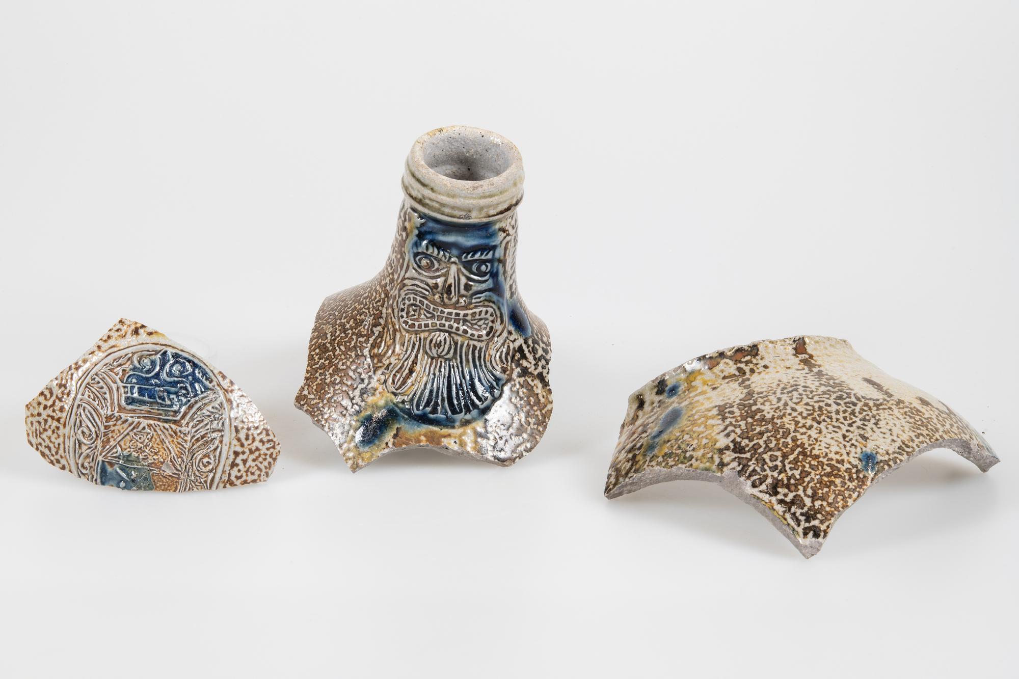 Feature description: Bartmann jug (fragments); s2-kan-32; convex jug with shoulder transitioning into a high neck with ribbed collar edge, base, ribbon handle (missing); stoneware with surface treatment: iron engobe and accents of cobalt oxide, salt glaze; appliqués: mask on neck and medallion on belly with coat of arms; origin: Frechen, Germany