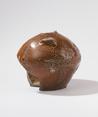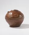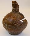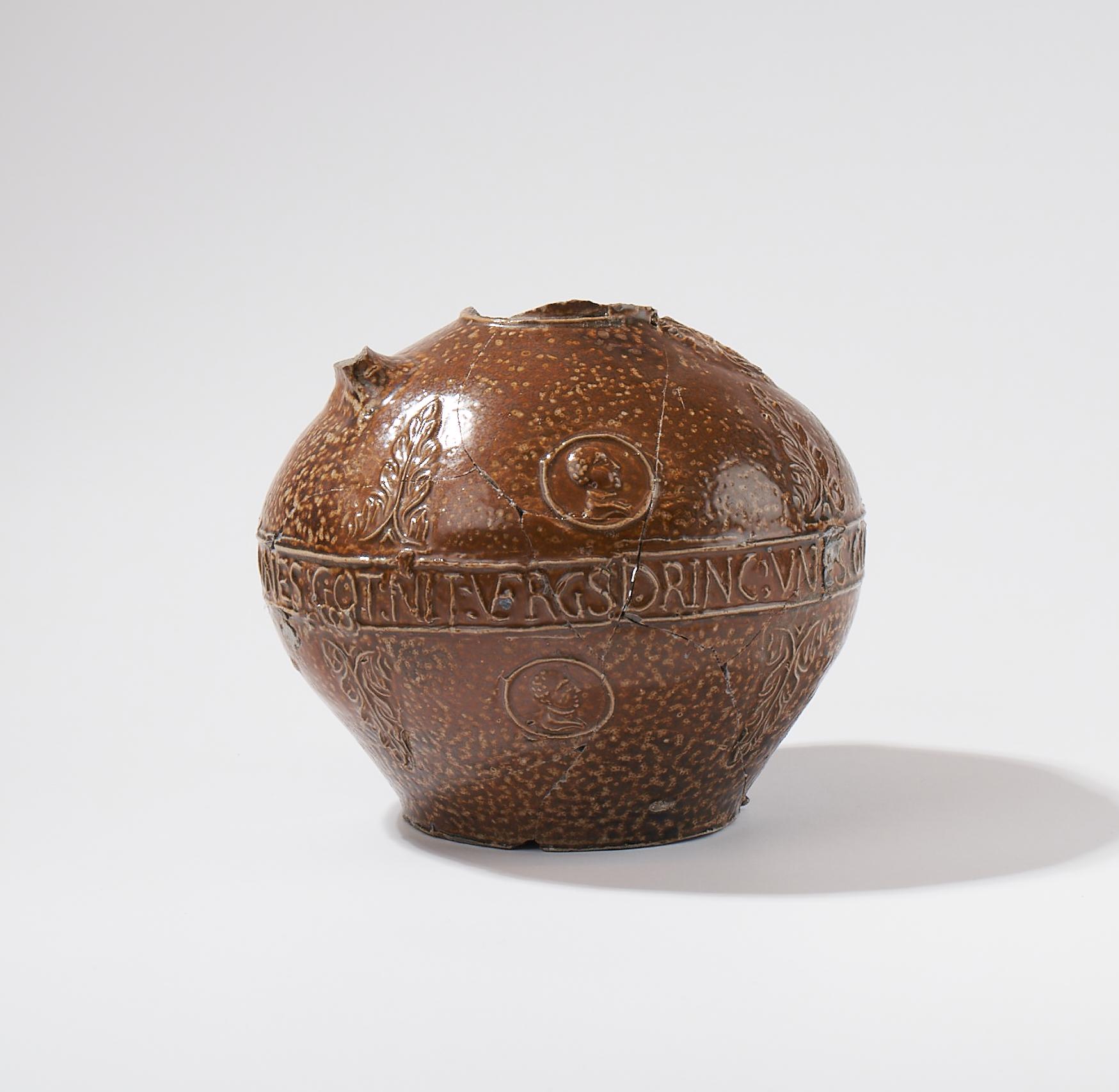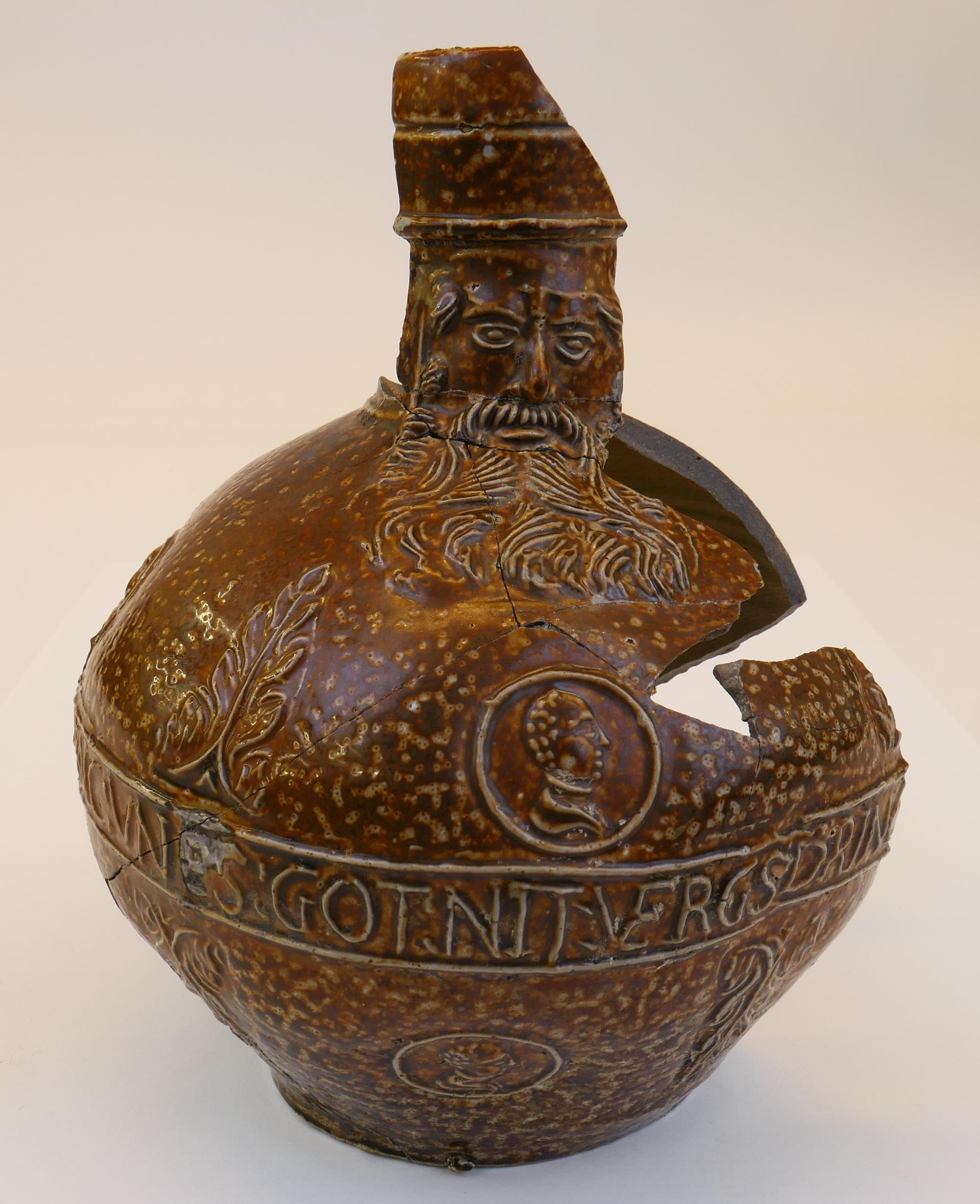 Feature description: An incomplete, partially glued brown-glazed stoneware jug. The belly has paintings in the form of text, floral decorations and men's heads on it. Around the jug is a text: DRINC VN ES GOT NIT VERGS, which means “drink and eat, but do not forget God”.