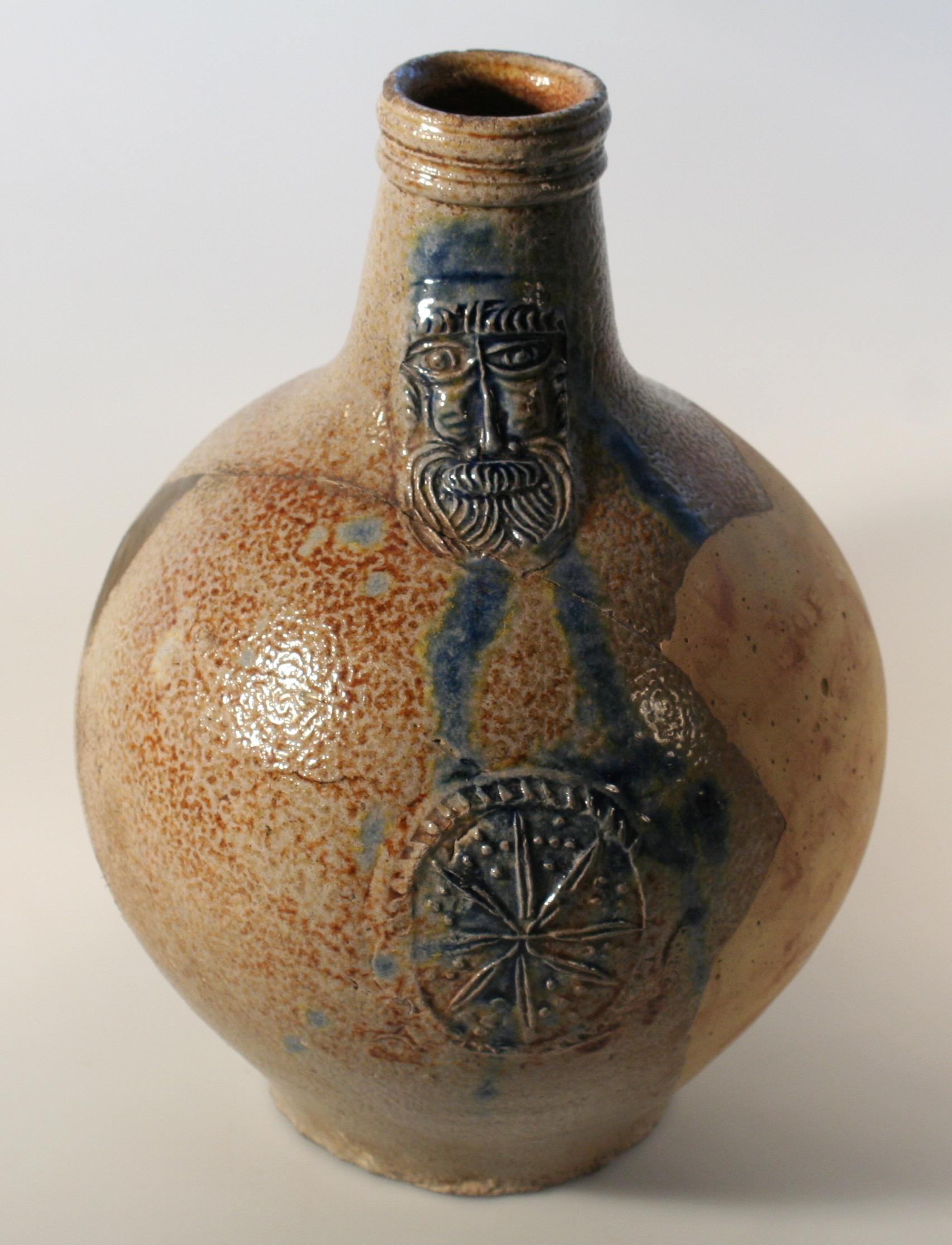 Feature description: Almost complete Bartmann jug (Westerwald-Frechen) with sausage handle and decorated with a mask and a medallion. The glaze is mottled and has traces of cobalt.