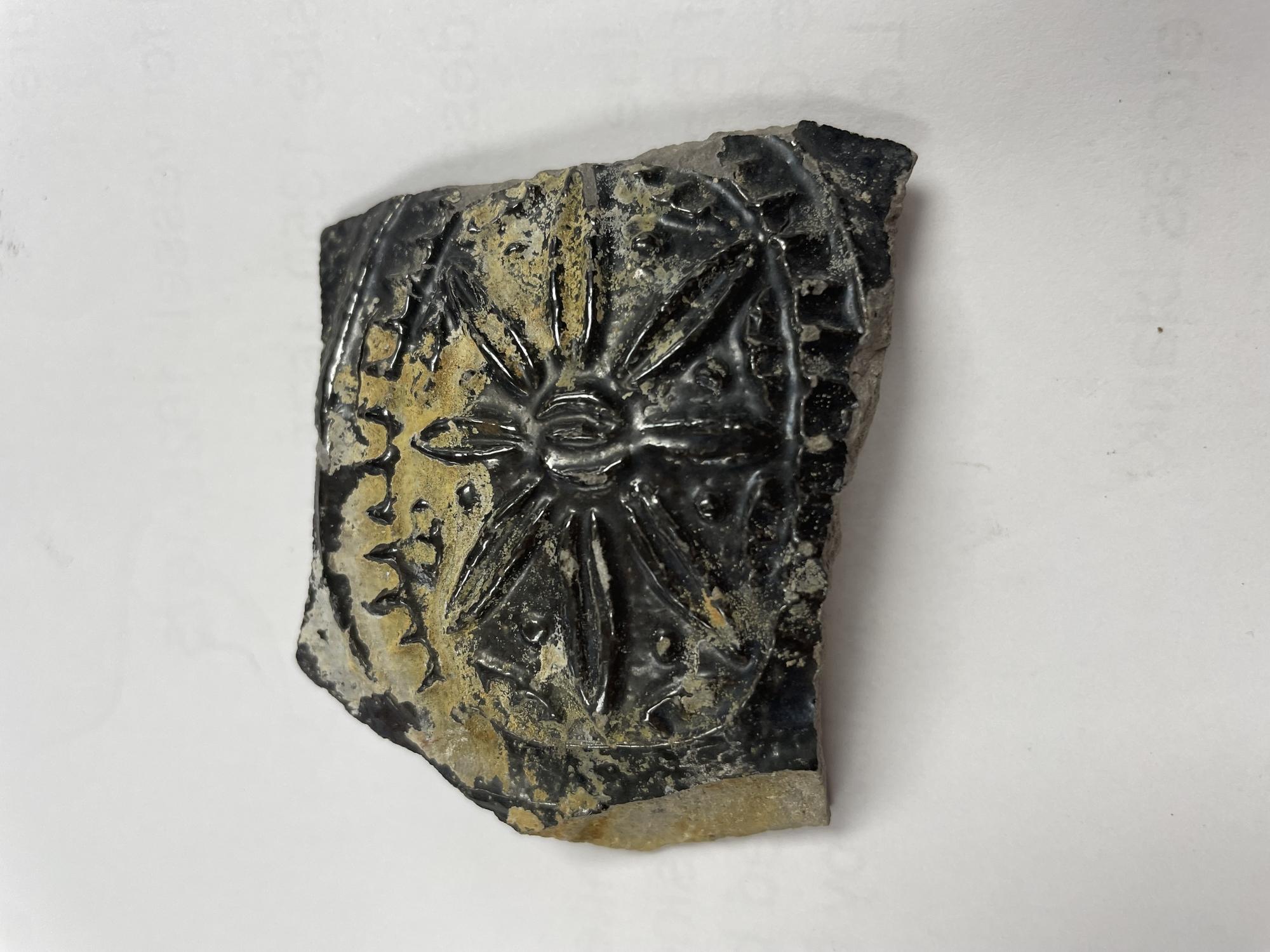 Feature description: Just one fragment of the jug is preserved. The sherd has a partly preserved medallion on it, which shows floral decoration.