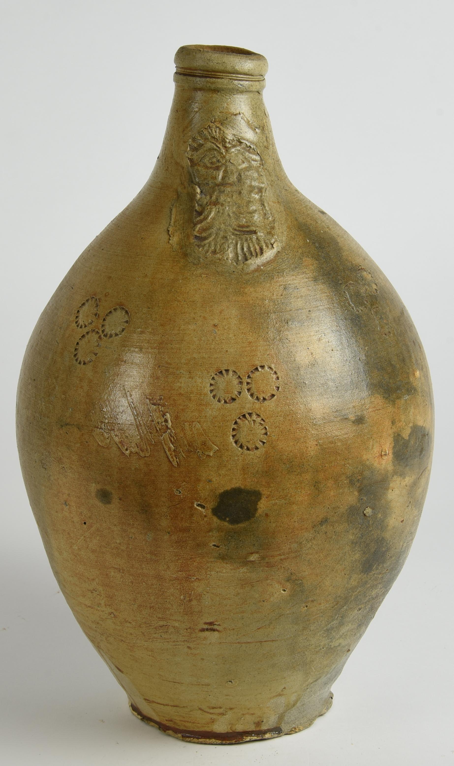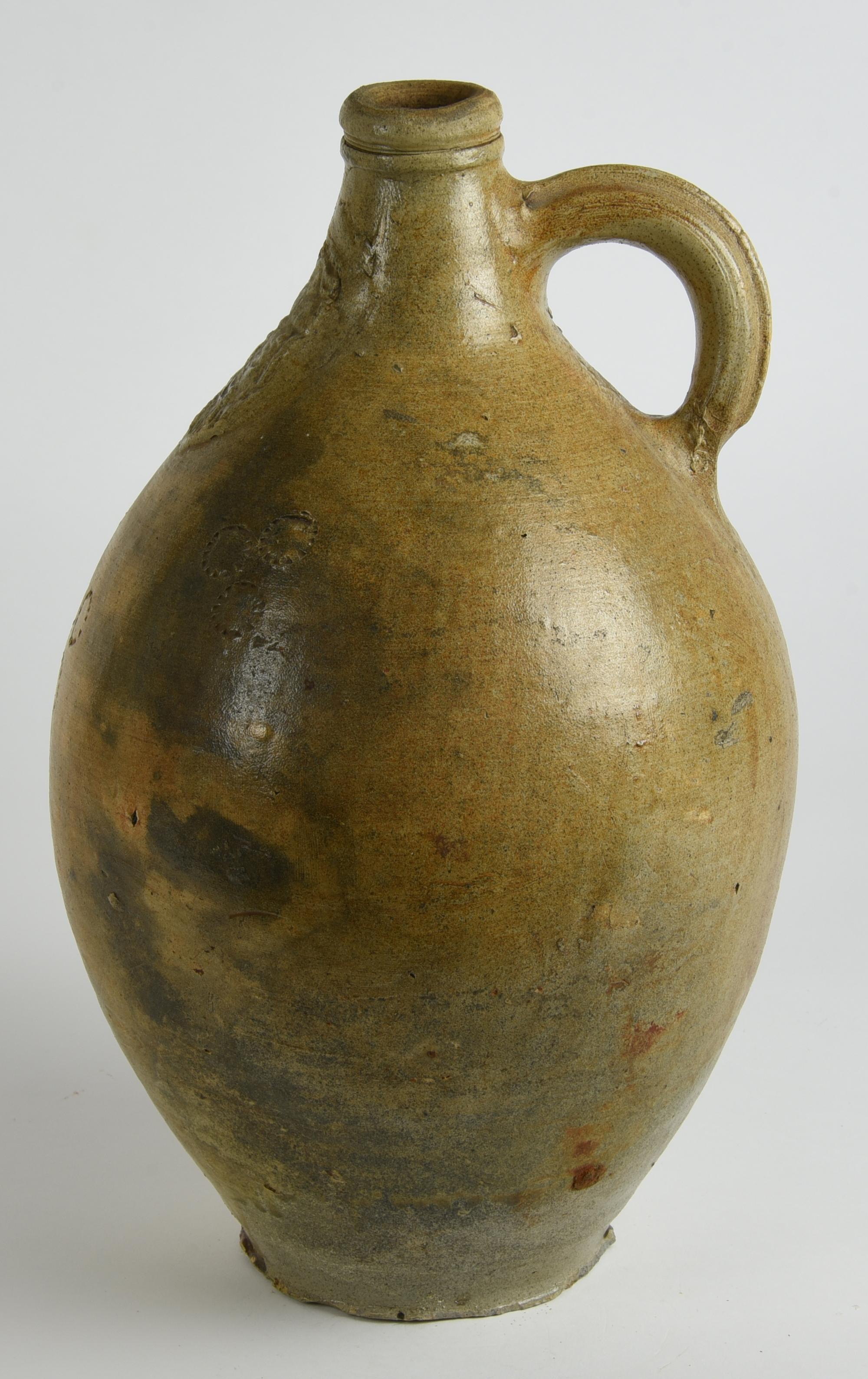 Feature description: German oil or beer pitcher from Stadtlohn/Vreden with bearded man applique on the neck and three times three circular stamps on the belly (s2-kan-32).