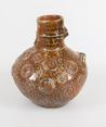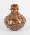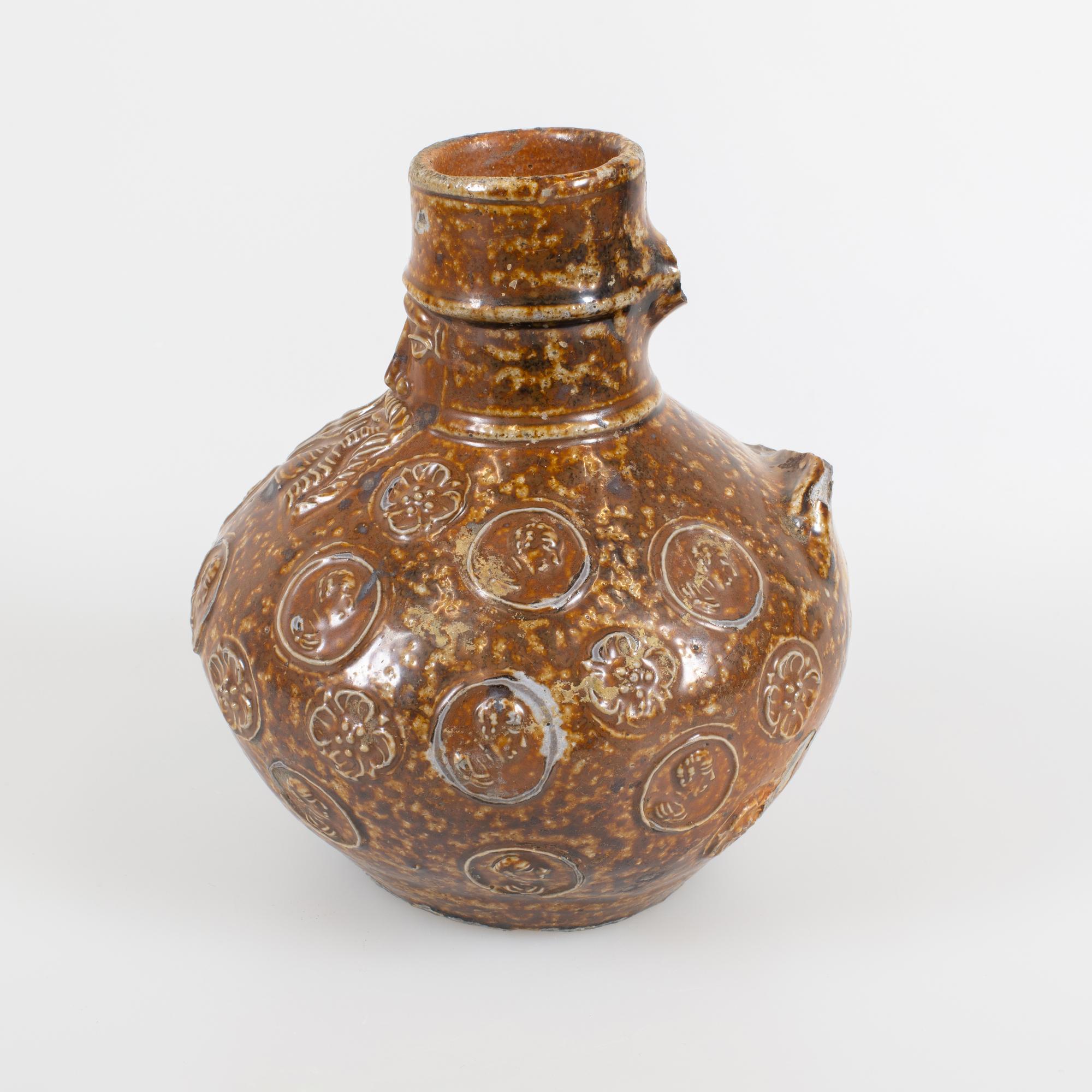 Feature description: Bartmann jug; s2-kan-13; convex jug with an almost cylindrical neck and high collar rim, ribbing at the base of the neck, flat base, ribbon handle (missing); stoneware with surface treatment: iron engobe, salt glaze; appliqués: mask on neck and belly covered with portrait medallions and rosettes; origin: Germany, Cologne or Frechen.