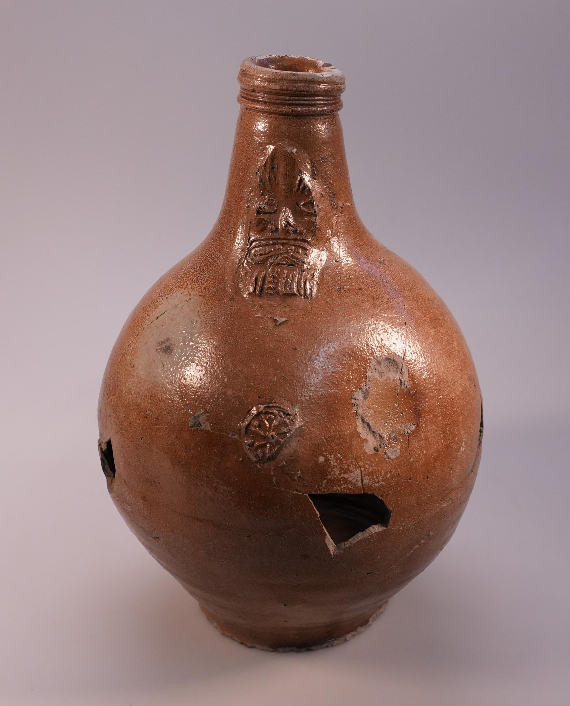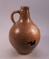 Feature description: Bartmann jug with a dent on the belly and a medallion with a flower motif