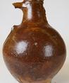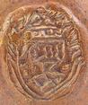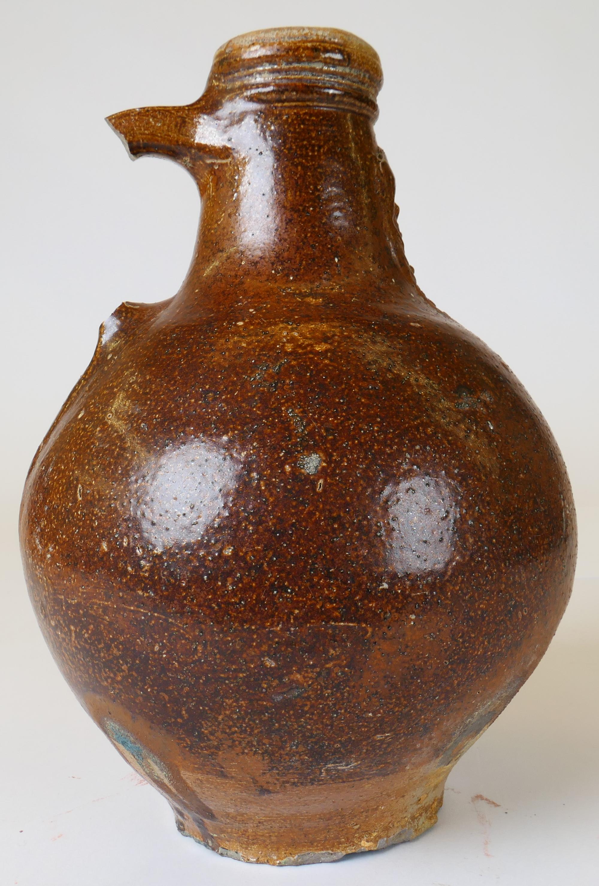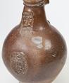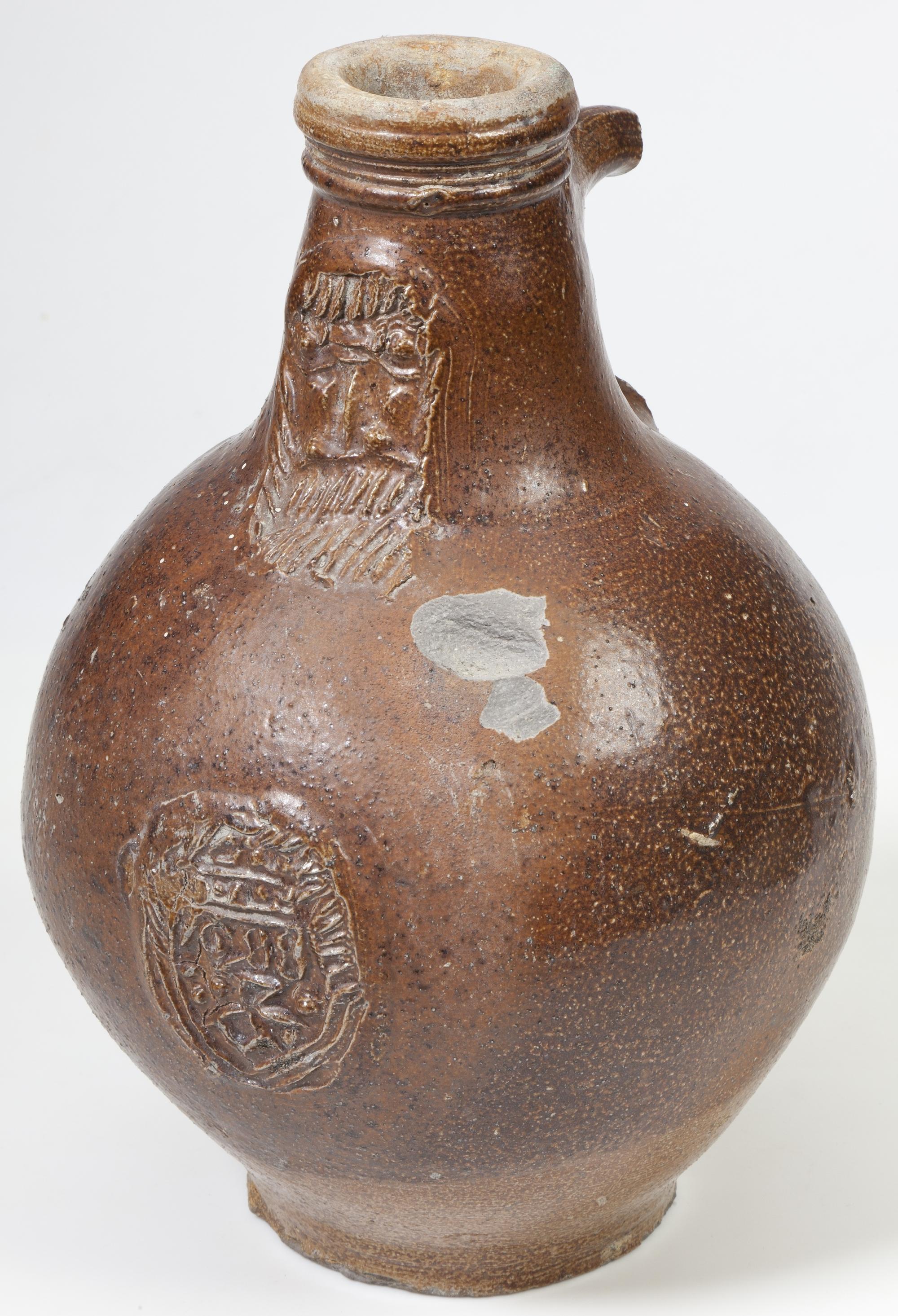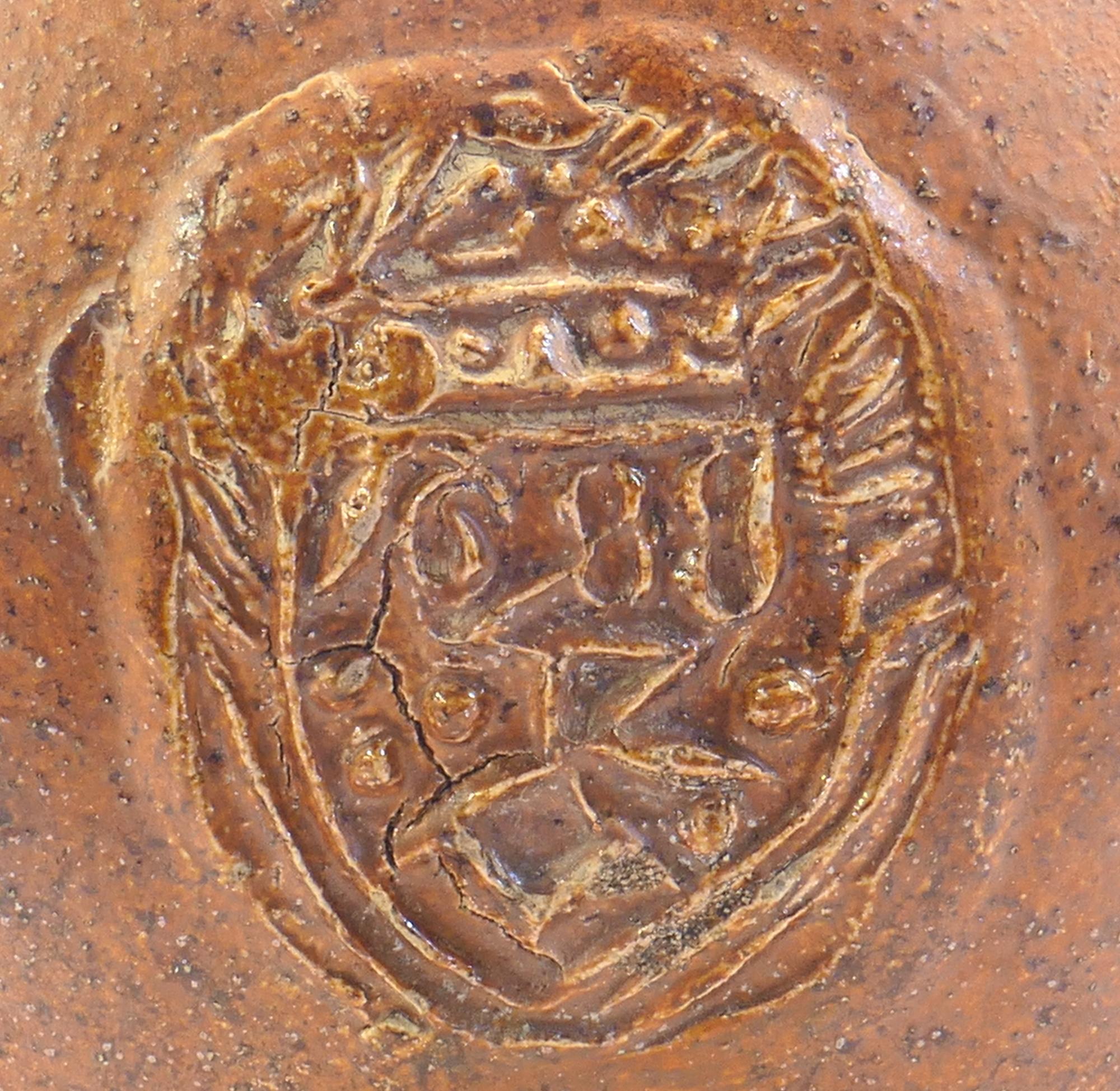 Feature description: Bartmann jug with flat, slightly concave bottom with turning marks, pear-shaped model, profiled rim, vertical (missing) sausage handle, slight rim at shoulder-neck transition, stylized mask on front of neck, medallion with crowned date 1688 and house mark.