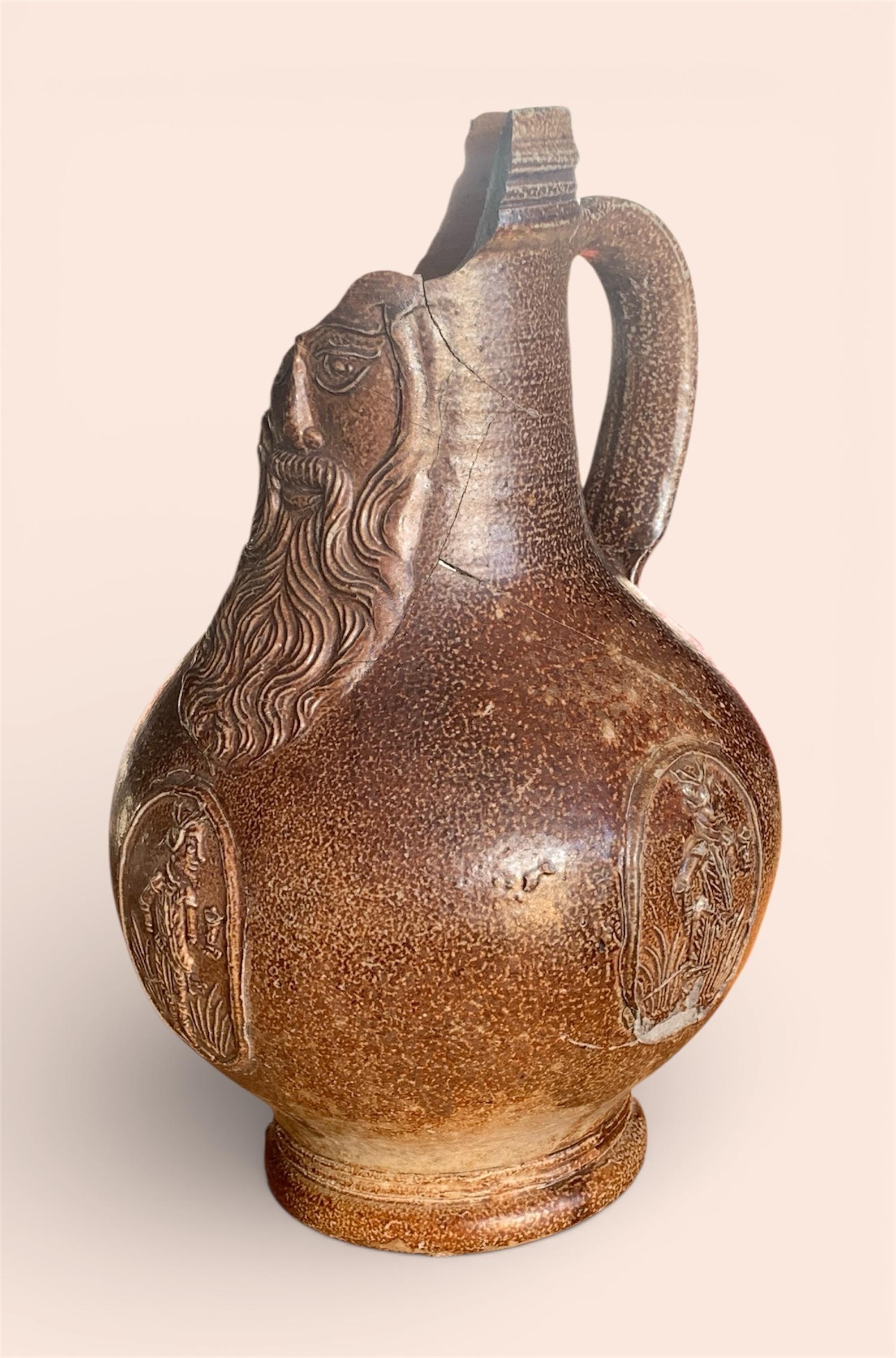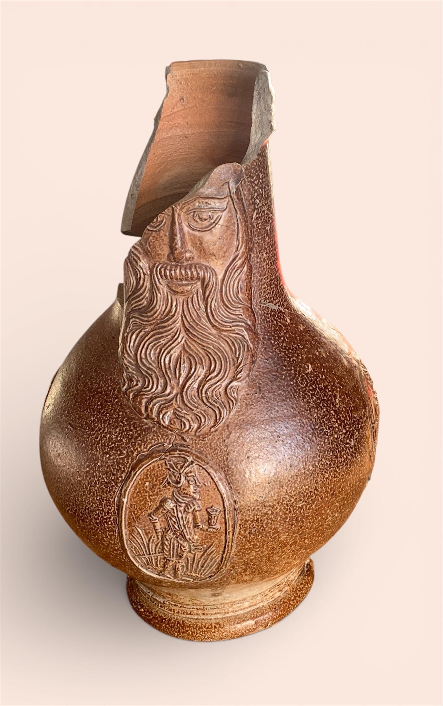 Feature description: Bartmann jug with mask and three medallions.