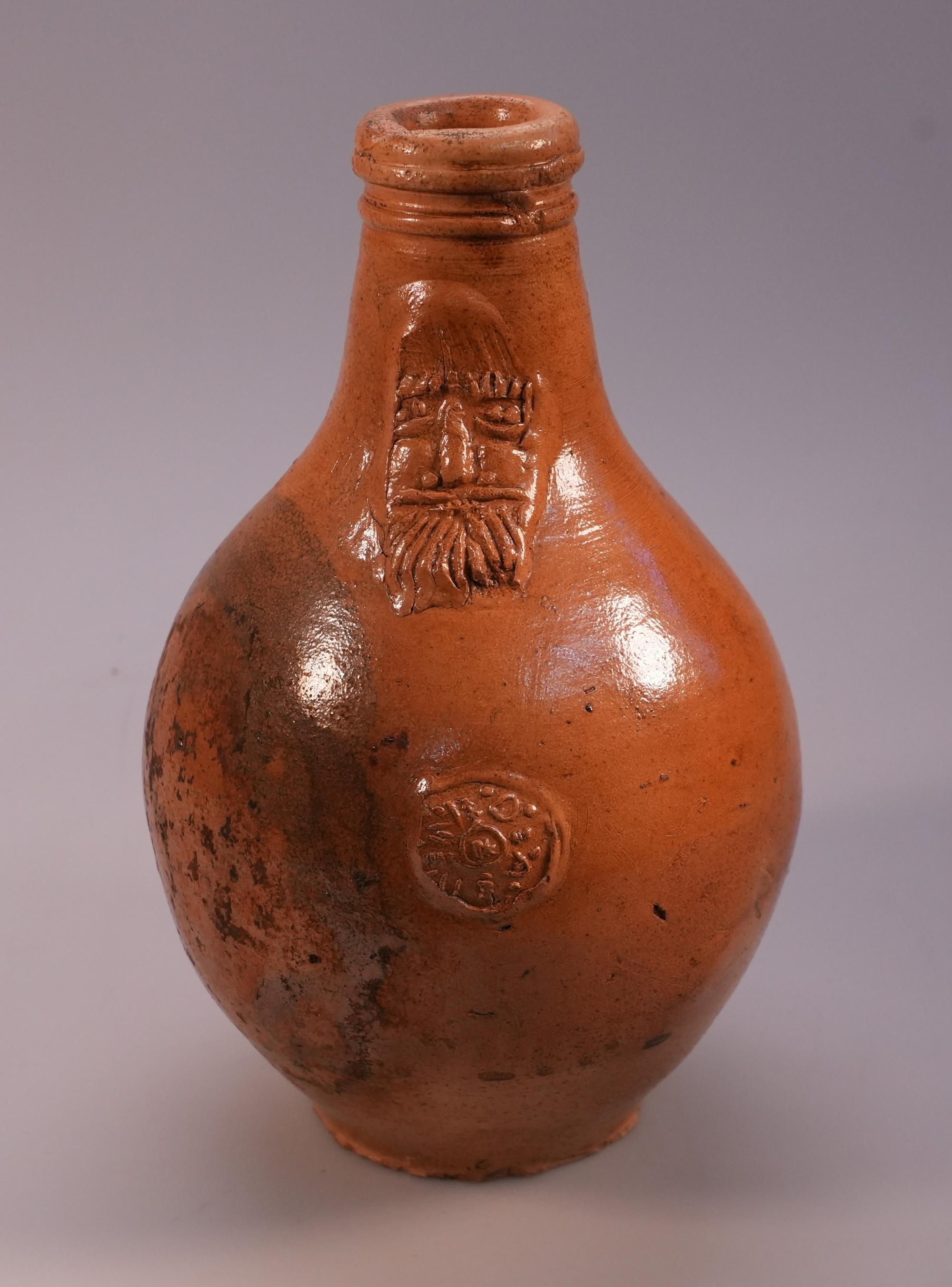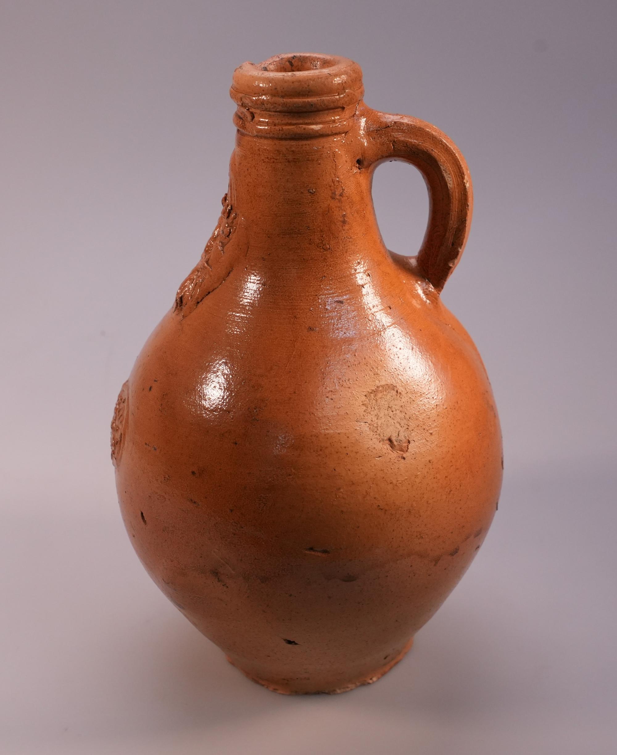 Feature description: Bartmann jug with a medallion bearing the letters D and A.