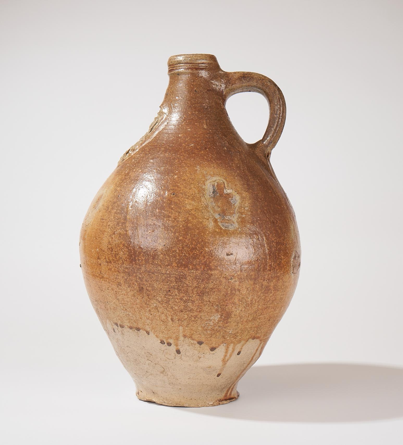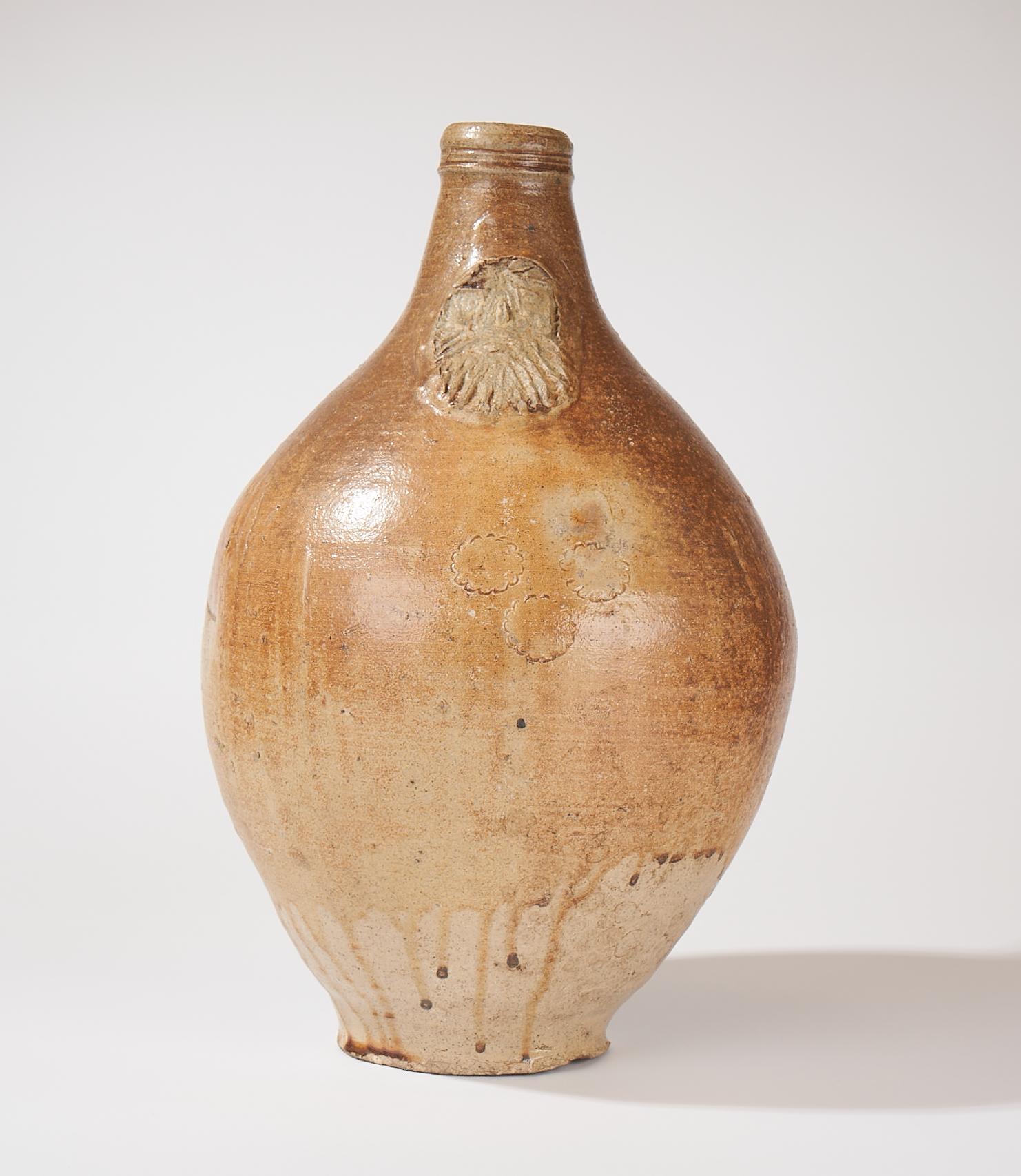 Feature description: A large and complete stoneware bartmann jug with handle, featuring a poorly drawn mask and stamped with primitive floral figures, probably from the 18th century.
