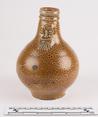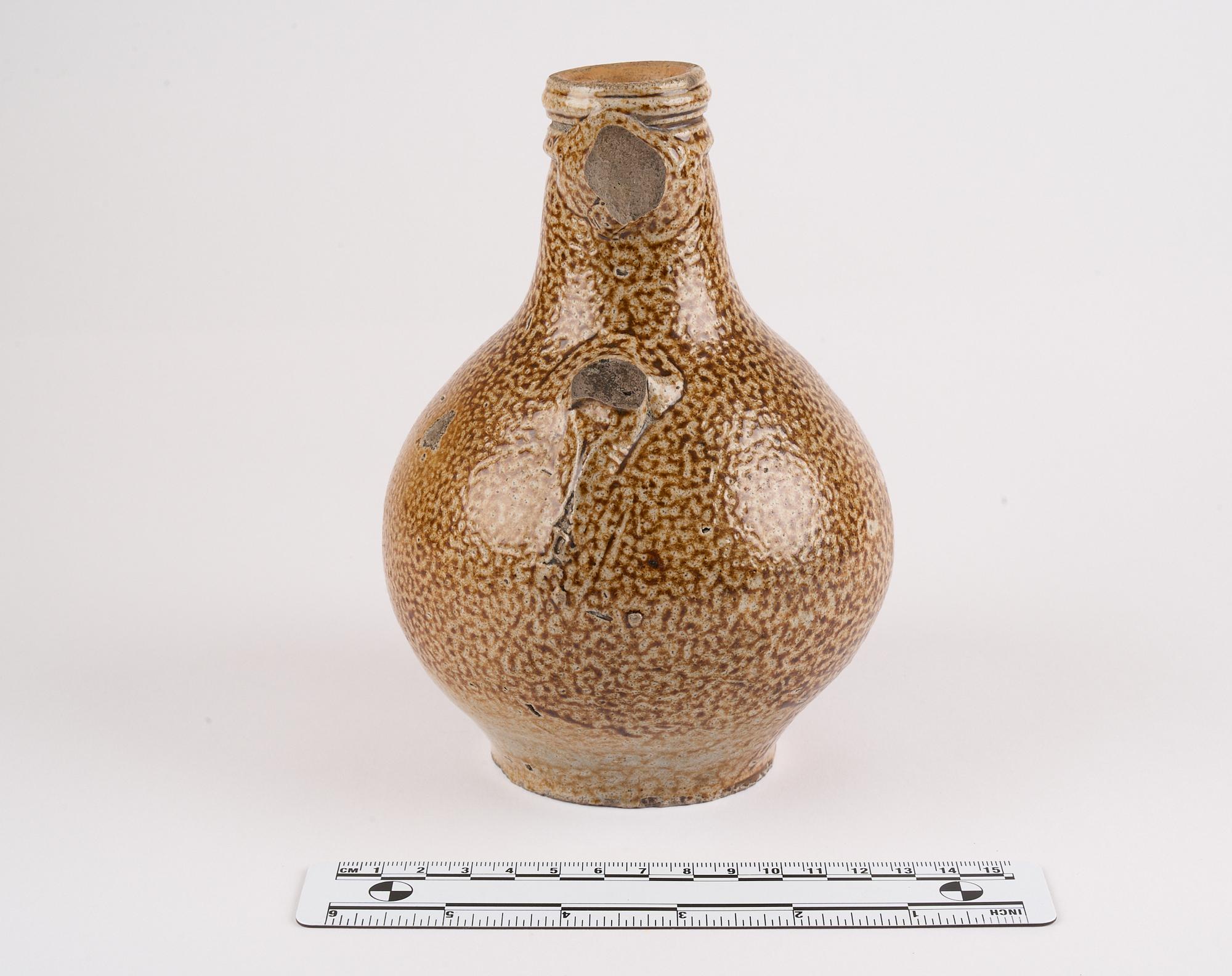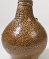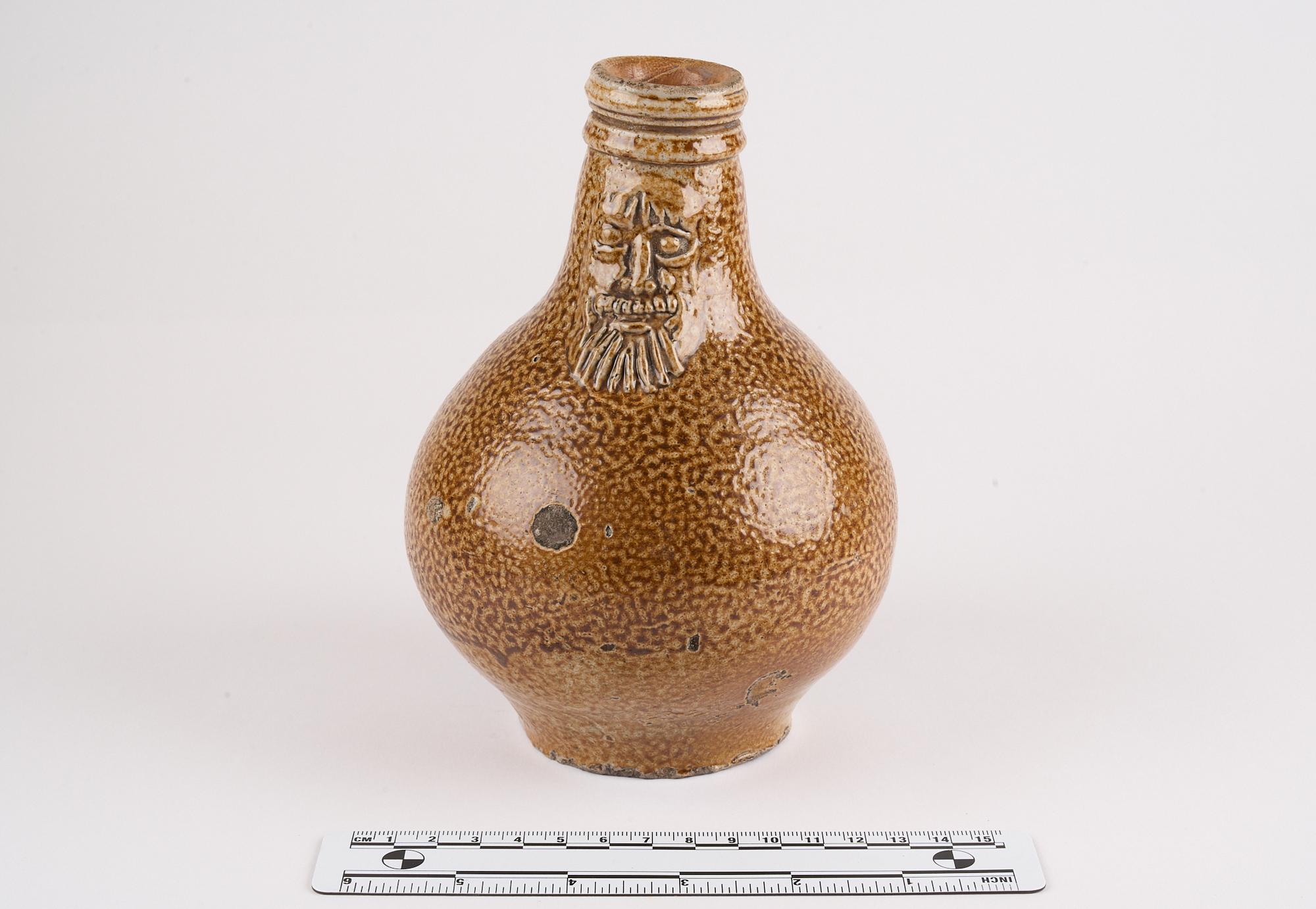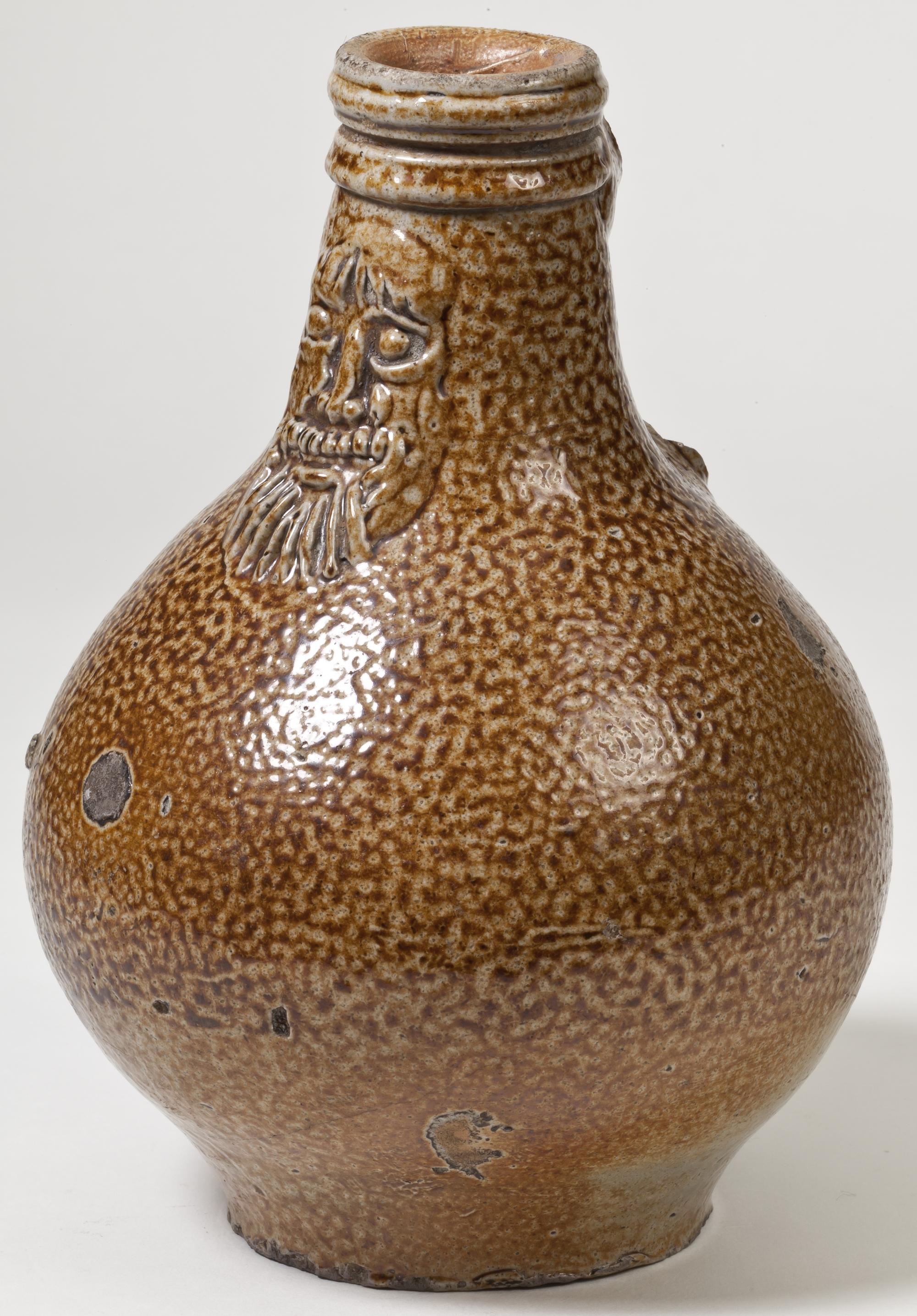 Feature description: Bartmann jug with flat, slightly concave bottom with faint traces of wear, pear-shaped model with profiled rim, vertical (missing) sausage handle, mask on the front of the neck.