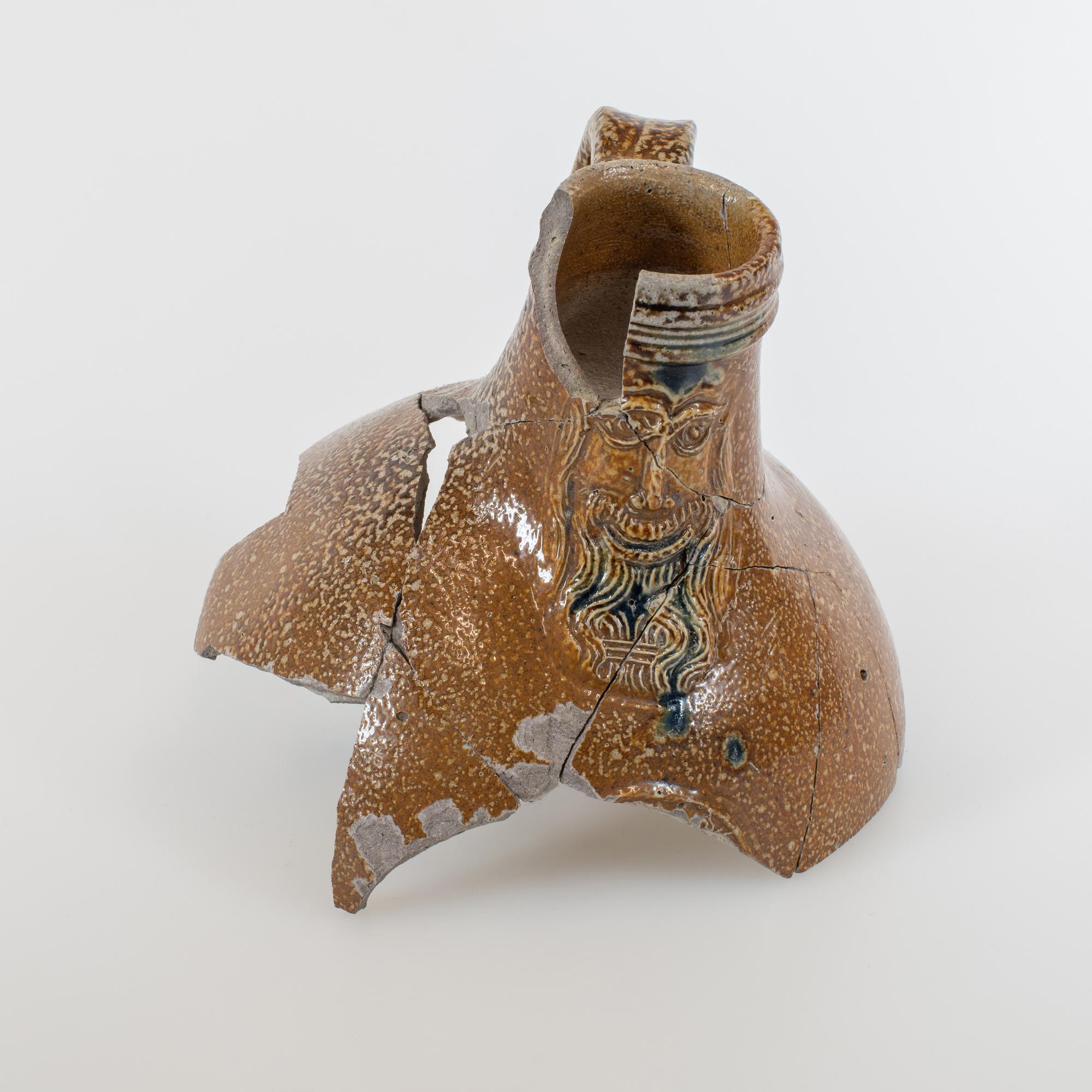 Feature description: Bartmann jug (edge fragment); s2-kan-32; convex jug with shoulder transitioning into a high neck with ribbed collar edge, ribbon handle; stoneware with surface treatment: iron engobe and accents of cobalt oxide, salt glaze; appliqués: mask on neck and medallion on belly; origin: Frechen, Germany