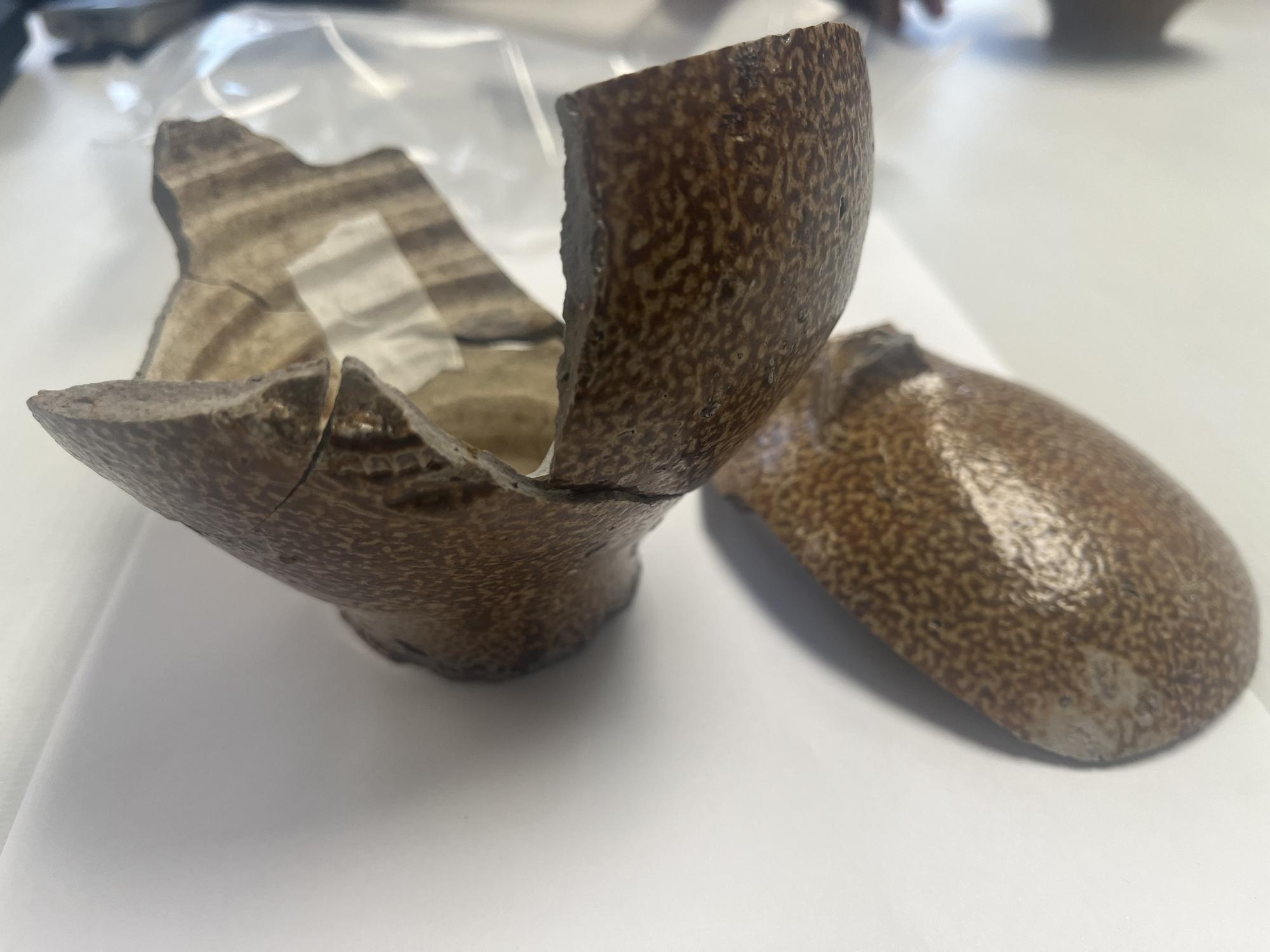 Feature description: An incomplete pot, consisting of the foot, part of the bottom section, and a fragment of the upper side where the handle was attached. A small section of the medallion frame is also visible.